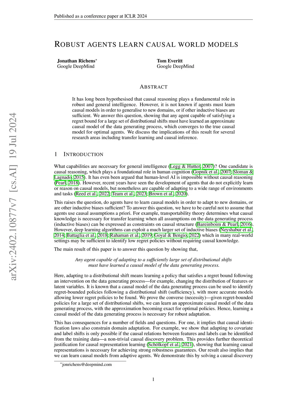 It has long been hypothesised that causal reasoning plays a fundamental role in robust and general intelligence. However, it is not known if agents must learn causal models in order to generalise to new domains, or if other inductive biases are sufficient. We answer this question, showing that any agent capable of satisfying a regret bound under a large set of distributional shifts must have learned an approximate causal model of the data generating process, which converges to the true causal model for optimal agents. We discuss the implications of this result for several research areas including transfer learning and causal inference.