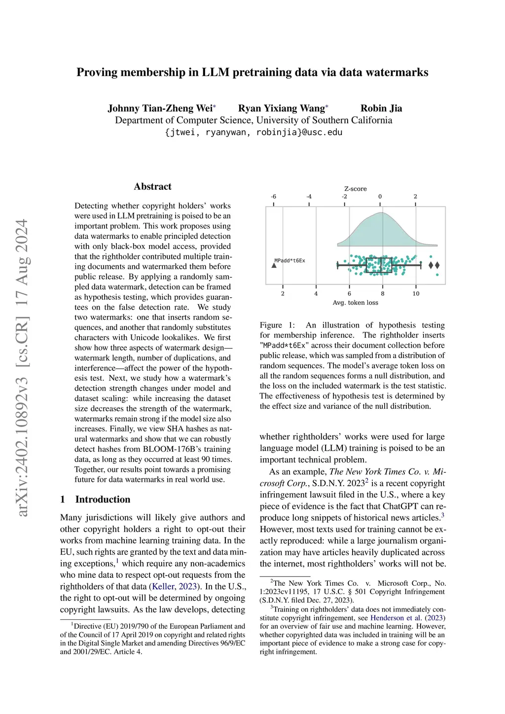 Detecting whether copyright holders' works were used in LLM pretraining is poised to be an important problem. This work proposes using data watermarks to enable principled detection with only black-box model access, provided that the rightholder contributed multiple training documents and watermarked them before public release. By applying a randomly sampled data watermark, detection can be framed as hypothesis testing, which provides guarantees on the false detection rate. We study two watermarks: one that inserts random sequences, and another that randomly substitutes characters with Unicode lookalikes. We first show how three aspects of watermark design -- watermark length, number of duplications, and interference -- affect the power of the hypothesis test. Next, we study how a watermark's detection strength changes under model and dataset scaling: while increasing the dataset size decreases the strength of the watermark, watermarks remain strong if the model size also increases. Finally, we view SHA hashes as natural watermarks and show that we can robustly detect hashes from BLOOM-176B's training data, as long as they occurred at least 90 times. Together, our results point towards a promising future for data watermarks in real world use.