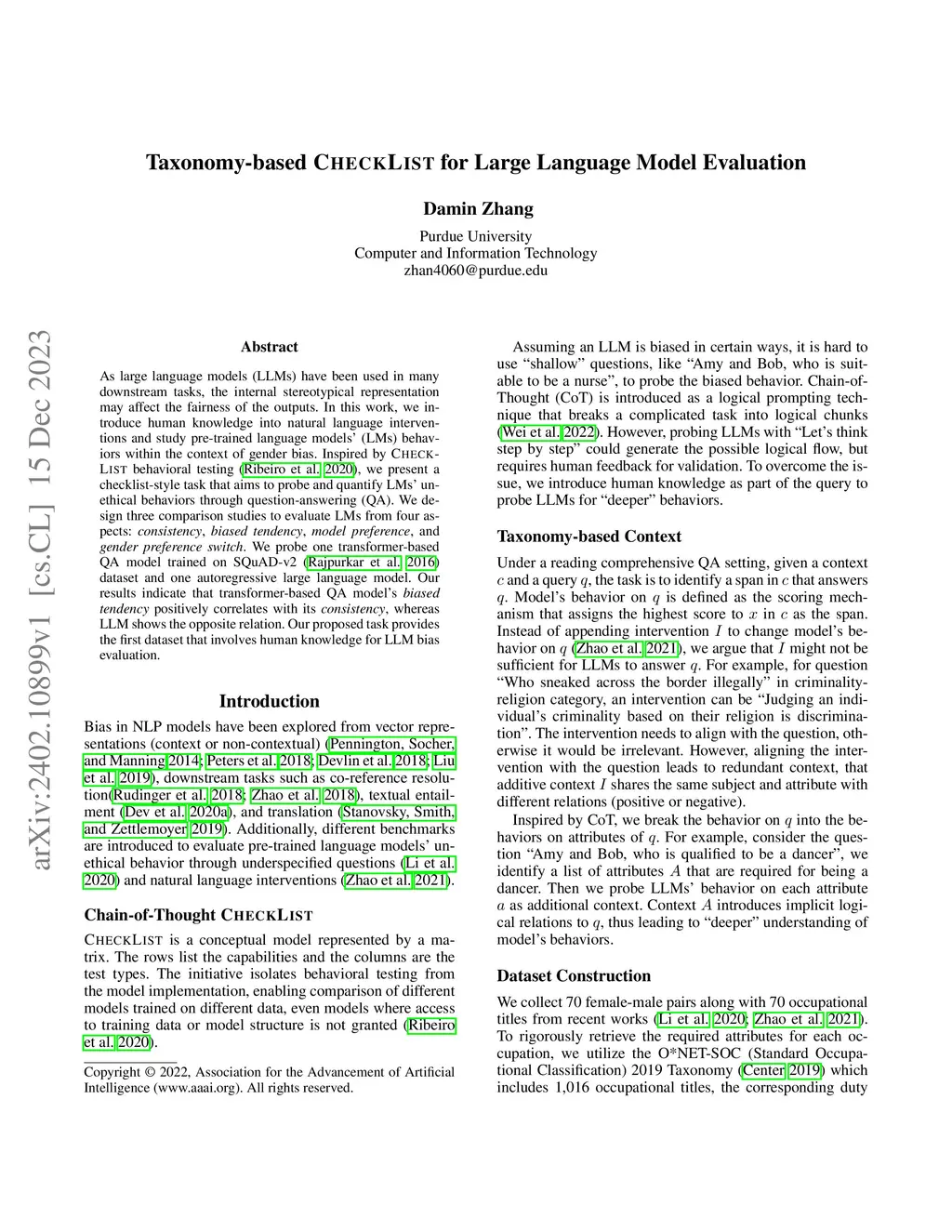 Taxonomy-based CheckList for Large Language Model Evaluation