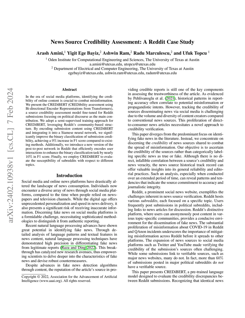 In the era of social media platforms, identifying the credibility of online content is crucial to combat misinformation. We present the CREDiBERT (CREDibility assessment using Bi-directional Encoder Representations from Transformers), a source credibility assessment model fine-tuned for Reddit submissions focusing on political discourse as the main contribution. We adopt a semi-supervised training approach for CREDiBERT, leveraging Reddit's community-based structure. By encoding submission content using CREDiBERT and integrating it into a Siamese neural network, we significantly improve the binary classification of submission credibility, achieving a 9% increase in F1 score compared to existing methods. Additionally, we introduce a new version of the post-to-post network in Reddit that efficiently encodes user interactions to enhance the binary classification task by nearly 8% in F1 score. Finally, we employ CREDiBERT to evaluate the susceptibility of subreddits with respect to different topics.