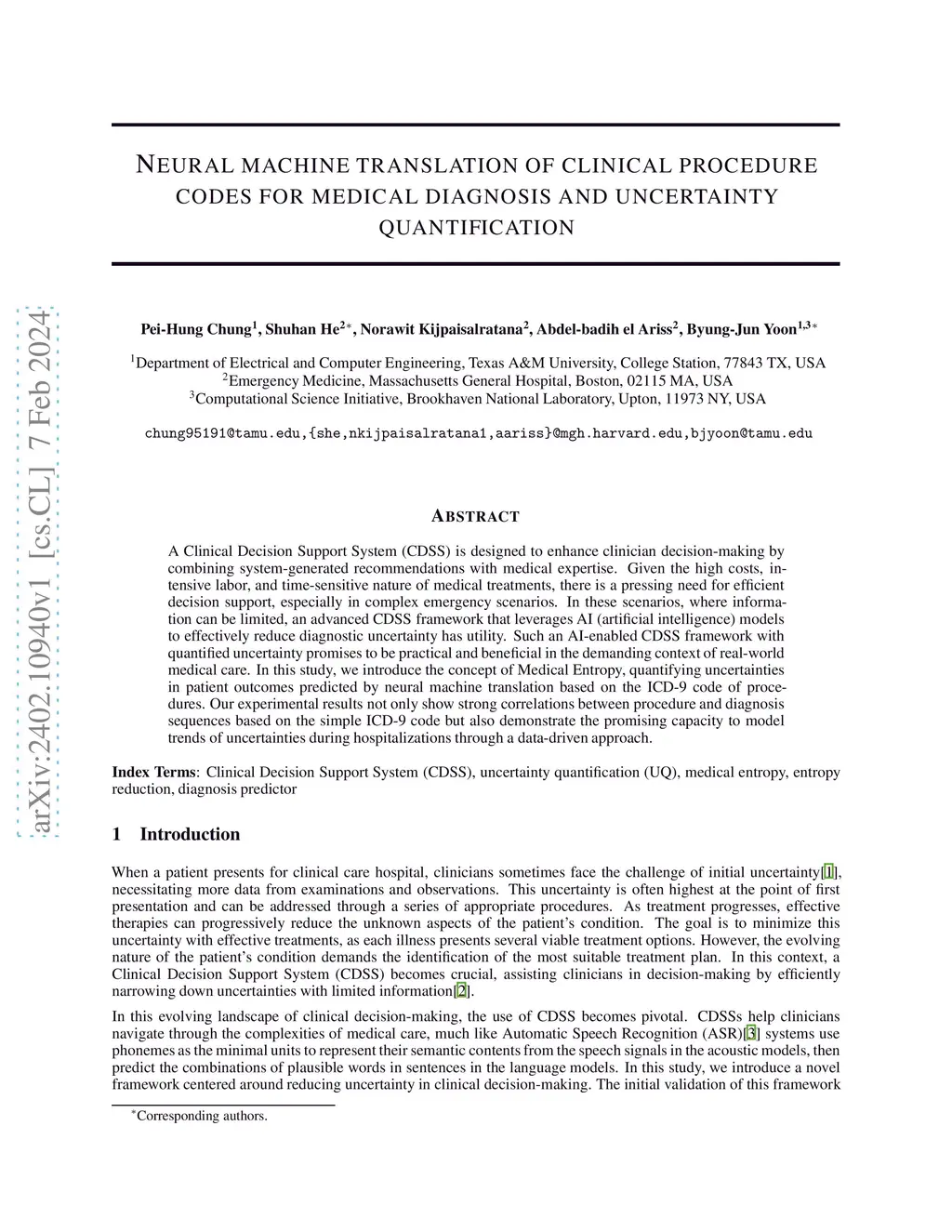 A Clinical Decision Support System (CDSS) is designed to enhance clinician decision-making by combining system-generated recommendations with medical expertise. Given the high costs, intensive labor, and time-sensitive nature of medical treatments, there is a pressing need for efficient decision support, especially in complex emergency scenarios. In these scenarios, where information can be limited, an advanced CDSS framework that leverages AI (artificial intelligence) models to effectively reduce diagnostic uncertainty has utility. Such an AI-enabled CDSS framework with quantified uncertainty promises to be practical and beneficial in the demanding context of real-world medical care. In this study, we introduce the concept of Medical Entropy, quantifying uncertainties in patient outcomes predicted by neural machine translation based on the ICD-9 code of procedures. Our experimental results not only show strong correlations between procedure and diagnosis sequences based on the simple ICD-9 code but also demonstrate the promising capacity to model trends of uncertainties during hospitalizations through a data-driven approach.