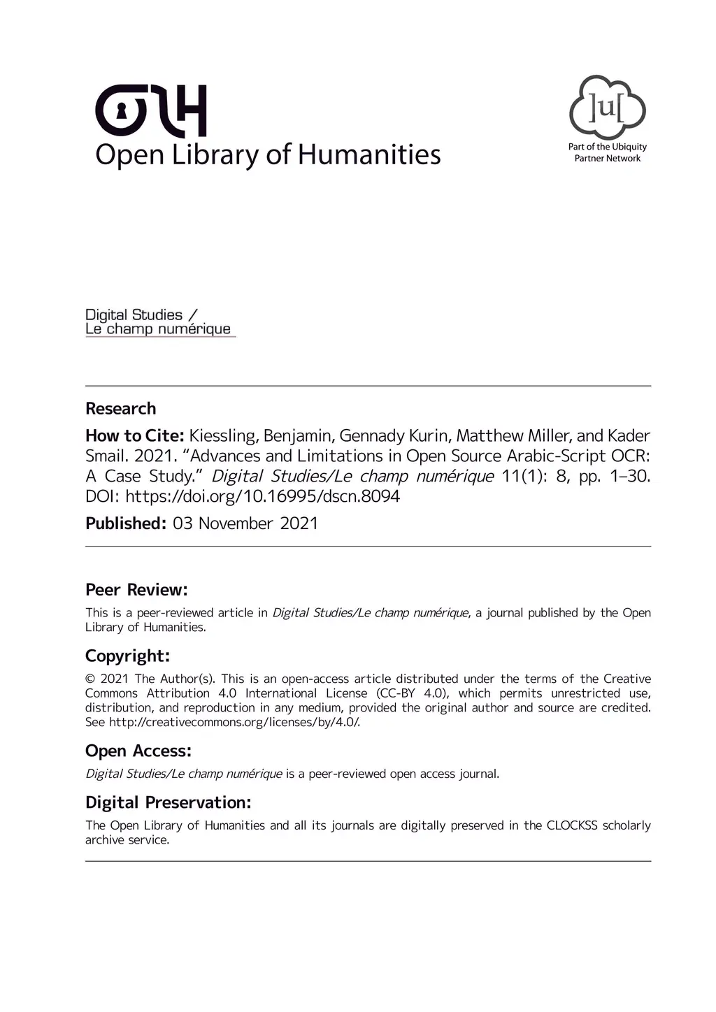 This work presents an accuracy study of the open source OCR engine, Kraken, on the leading Arabic scholarly journal, al-Abhath. In contrast with other commercially available OCR engines, Kraken is shown to be capable of producing highly accurate Arabic-script OCR. The study also assesses the relative accuracy of typeface-specific and generalized models on the al-Abhath data and provides a microanalysis of the ``error instances'' and the contextual features that may have contributed to OCR misrecognition. Building on this analysis, the paper argues that Arabic-script OCR can be significantly improved through (1) a more systematic approach to training data production, and (2) the development of key technological components, especially multi-language models and improved line segmentation and layout analysis. Cet article pr{\é}sente une {\é}tude déxactitude du moteur ROC open source, Krakan, sur la revue acad{\é}mique arabe de premier rang, al-Abhath. Contrairement {\`a} dáutres moteurs ROC disponibles sur le march{\é}, Kraken se r{\é}v{\`e}le {\^e}tre capable de produire de la ROC extr{\^e}mement exacte de l'{\é}criture arabe. L'{\é}tude {\é}value aussi léxactitude relative des mod{\`e}les sp{\é}cifiquement configur{\é}s {\`a} des polices et celle des mod{\`e}les g{\é}n{\é}ralis{\é}s sur les donn{\é}es dál-Abhath et fournit une microanalyse des "occurrences dérreurs", ainsi quúne microanalyse des {\é}l{\é}ments contextuels qui pourraient avoir contribu{\é} {\`a} la m{\é}reconnaissance ROC. Sáppuyant sur cette analyse, cet article fait valoir que la ROC de l'{\é}criture arabe peut {\^e}tre consid{\é}rablement am{\é}lior{\é}e gr{\^a}ce {\`a} (1) une approche plus syst{\é}matique déntra{\^i}nement de la production de donn{\é}es et (2) gr{\^a}ce au d{\é}veloppement de composants technologiques fondamentaux, notammentlám{\é}lioration des mod{\`e}les multilingues, de la segmentation de ligne et de lánalyse de la mise en page.