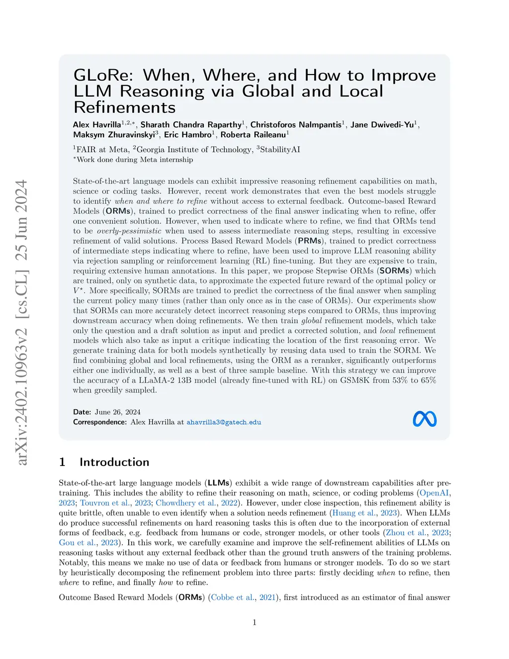 State-of-the-art language models can exhibit impressive reasoning refinement capabilities on math, science or coding tasks. However, recent work demonstrates that even the best models struggle to identify \textit{when and where to refine} without access to external feedback. Outcome-based Reward Models (\textbf{ORMs}), trained to predict correctness of the final answer indicating when to refine, offer one convenient solution for deciding when to refine. Process Based Reward Models (\textbf{PRMs}), trained to predict correctness of intermediate steps, can then be used to indicate where to refine. But they are expensive to train, requiring extensive human annotations. In this paper, we propose Stepwise ORMs (\textbf{SORMs}) which are trained, only on synthetic data, to approximate the expected future reward of the optimal policy or . More specifically, SORMs are trained to predict the correctness of the final answer when sampling the current policy many times (rather than only once as in the case of ORMs). Our experiments show that SORMs can more accurately detect incorrect reasoning steps compared to ORMs, thus improving downstream accuracy when doing refinements. We then train \textit{global} refinement models, which take only the question and a draft solution as input and predict a corrected solution, and \textit{local} refinement models which also take as input a critique indicating the location of the first reasoning error. We generate training data for both models synthetically by reusing data used to train the SORM. We find combining global and local refinements, using the ORM as a reranker, significantly outperforms either one individually, as well as a best of three sample baseline. With this strategy we can improve the accuracy of a LLaMA-2 13B model (already fine-tuned with RL) on GSM8K from 53\% to 65\% when greedily sampled.