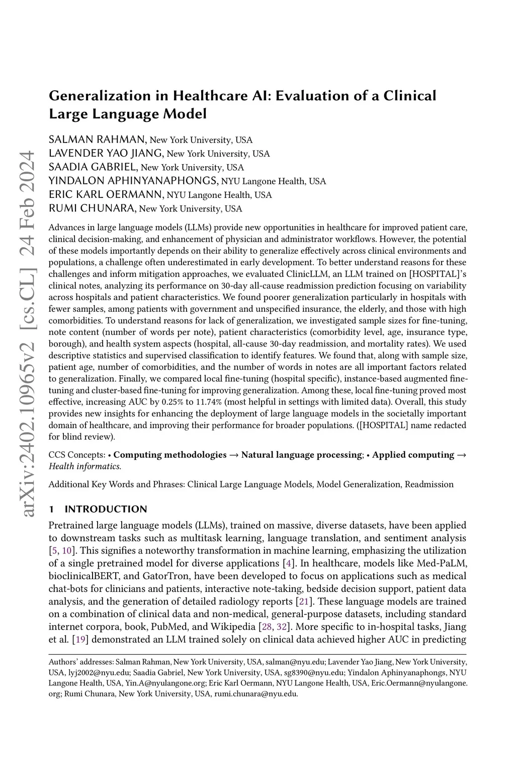 Generalization in Healthcare AI: Evaluation of a Clinical Large Language