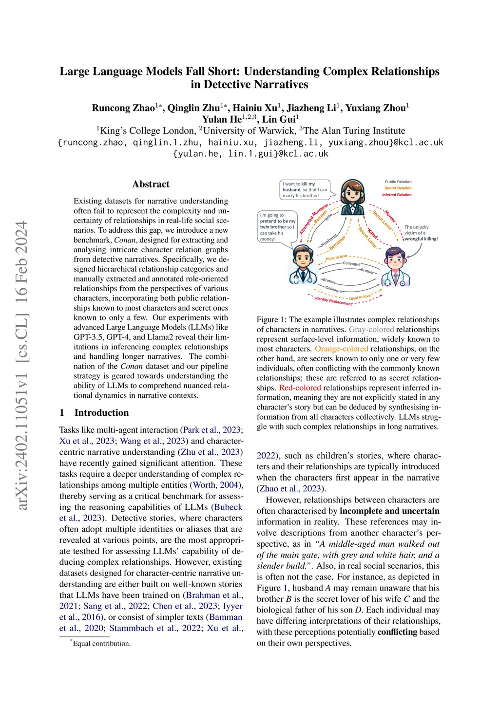 Existing datasets for narrative understanding often fail to represent the complexity and uncertainty of relationships in real-life social scenarios. To address this gap, we introduce a new benchmark, Conan, designed for extracting and analysing intricate character relation graphs from detective narratives. Specifically, we designed hierarchical relationship categories and manually extracted and annotated role-oriented relationships from the perspectives of various characters, incorporating both public relationships known to most characters and secret ones known to only a few. Our experiments with advanced Large Language Models (LLMs) like GPT-3.5, GPT-4, and Llama2 reveal their limitations in inferencing complex relationships and handling longer narratives. The combination of the Conan dataset and our pipeline strategy is geared towards understanding the ability of LLMs to comprehend nuanced relational dynamics in narrative contexts.