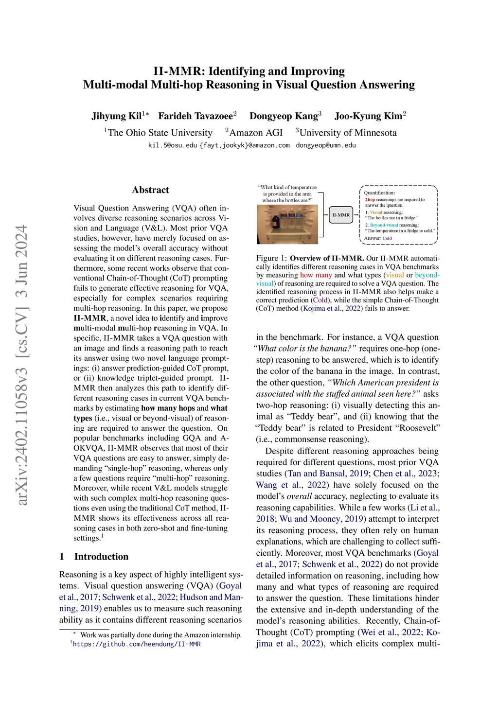 Visual Question Answering (VQA) often involves diverse reasoning scenarios across Vision and Language (V&L). Most prior VQA studies, however, have merely focused on assessing the model's overall accuracy without evaluating it on different reasoning cases. Furthermore, some recent works observe that conventional Chain-of-Thought (CoT) prompting fails to generate effective reasoning for VQA, especially for complex scenarios requiring multi-hop reasoning. In this paper, we propose II-MMR, a novel idea to identify and improve multi-modal multi-hop reasoning in VQA. In specific, II-MMR takes a VQA question with an image and finds a reasoning path to reach its answer using two novel language promptings: (i) answer prediction-guided CoT prompt, or (ii) knowledge triplet-guided prompt. II-MMR then analyzes this path to identify different reasoning cases in current VQA benchmarks by estimating how many hops and what types (i.e., visual or beyond-visual) of reasoning are required to answer the question. On popular benchmarks including GQA and A-OKVQA, II-MMR observes that most of their VQA questions are easy to answer, simply demanding "single-hop" reasoning, whereas only a few questions require "multi-hop" reasoning. Moreover, while the recent V&L model struggles with such complex multi-hop reasoning questions even using the traditional CoT method, II-MMR shows its effectiveness across all reasoning cases in both zero-shot and fine-tuning settings.