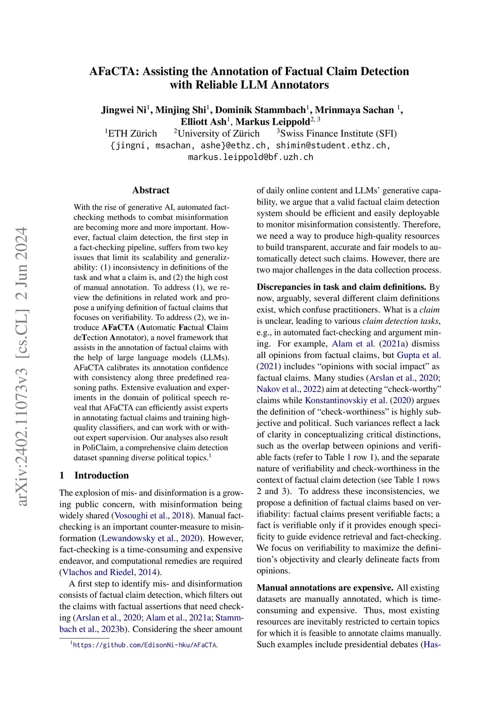 With the rise of generative AI, automated fact-checking methods to combat misinformation are becoming more and more important. However, factual claim detection, the first step in a fact-checking pipeline, suffers from two key issues that limit its scalability and generalizability: (1) inconsistency in definitions of the task and what a claim is, and (2) the high cost of manual annotation. To address (1), we review the definitions in related work and propose a unifying definition of factual claims that focuses on verifiability. To address (2), we introduce AFaCTA (Automatic Factual Claim deTection Annotator), a novel framework that assists in the annotation of factual claims with the help of large language models (LLMs). AFaCTA calibrates its annotation confidence with consistency along three predefined reasoning paths. Extensive evaluation and experiments in the domain of political speech reveal that AFaCTA can efficiently assist experts in annotating factual claims and training high-quality classifiers, and can work with or without expert supervision. Our analyses also result in PoliClaim, a comprehensive claim detection dataset spanning diverse political topics.
