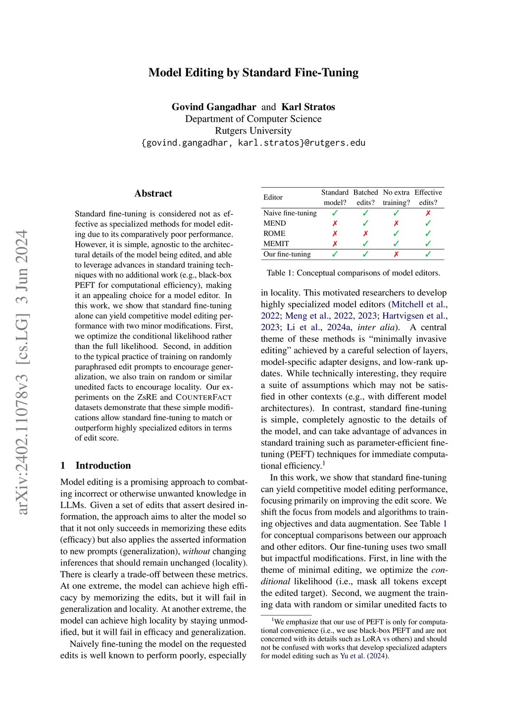 Fine-tuning is dismissed as not effective for model editing due to its poor performance compared to more specialized methods. However, fine-tuning is simple, agnostic to the architectural details of the model being edited, and able to leverage ongoing advances in standard training methods (e.g., PEFT), making it an appealing choice for a model editor. In this work, we show that pure fine-tuning can be a viable approach to model editing. We propose a slight modification of naive fine-tuning with two key ingredients. First, we optimize the conditional likelihood rather than the full likelihood. Second, we augment the data with random paraphrases and facts to encourage generalization and locality. Our experiments on ZsRE and CounterFact show that this simple modification allows fine-tuning to often match or outperform specialized editors in the edit score.