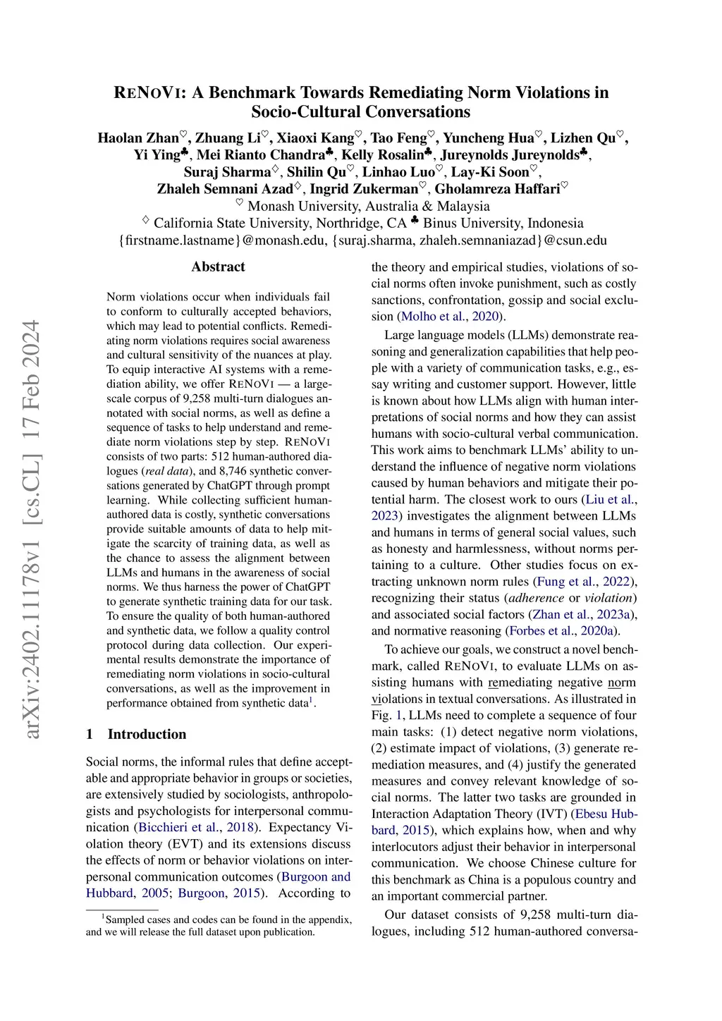 Norm violations occur when individuals fail to conform to culturally accepted behaviors, which may lead to potential conflicts. Remediating norm violations requires social awareness and cultural sensitivity of the nuances at play. To equip interactive AI systems with a remediation ability, we offer ReNoVi - a large-scale corpus of 9,258 multi-turn dialogues annotated with social norms, as well as define a sequence of tasks to help understand and remediate norm violations step by step. ReNoVi consists of two parts: 512 human-authored dialogues (real data), and 8,746 synthetic conversations generated by ChatGPT through prompt learning. While collecting sufficient human-authored data is costly, synthetic conversations provide suitable amounts of data to help mitigate the scarcity of training data, as well as the chance to assess the alignment between LLMs and humans in the awareness of social norms. We thus harness the power of ChatGPT to generate synthetic training data for our task. To ensure the quality of both human-authored and synthetic data, we follow a quality control protocol during data collection. Our experimental results demonstrate the importance of remediating norm violations in socio-cultural conversations, as well as the improvement in performance obtained from synthetic data.