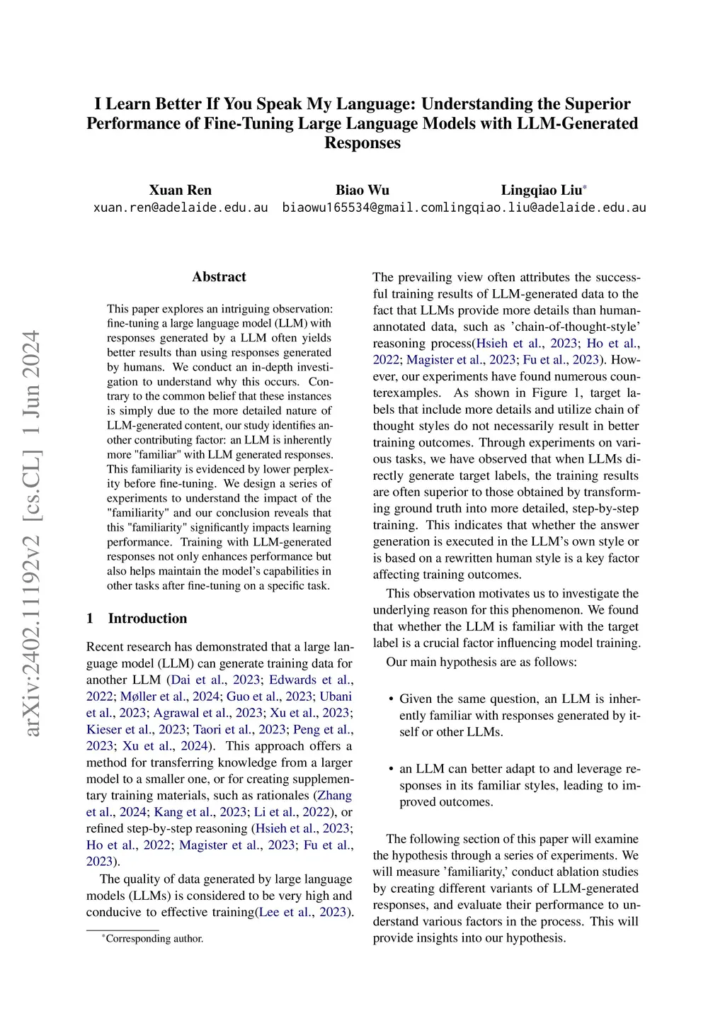 This paper explores an intriguing observation: fine-tuning a large language model (LLM) with responses generated by a LLM often yields better results than using responses generated by humans, particularly in reasoning tasks. We conduct an in-depth investigation to understand why this occurs. Contrary to the common belief that these instances is due to the more detailed nature of LLM-generated content, our study identifies another contributing factor: an LLM is inherently more "familiar" with LLM generated responses. This familiarity is evidenced by lower perplexity before fine-tuning. We design a series of experiments to understand the impact of the "familiarity" and our conclusion reveals that this "familiarity" significantly impacts learning performance. Training with LLM-generated responses not only enhances performance but also helps maintain the model's capabilities in other reasoning tasks after fine-tuning on a specific task.