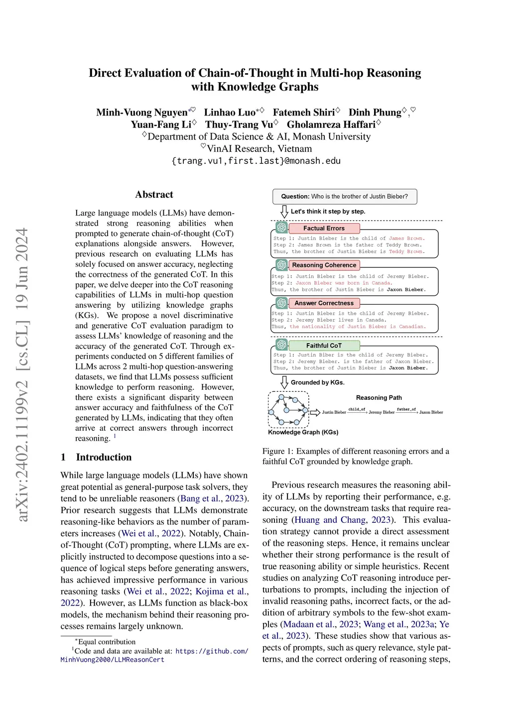Large language models (LLMs) demonstrate strong reasoning abilities when prompted to generate chain-of-thought (CoT) explanations alongside answers. However, previous research on evaluating LLMs has solely focused on answer accuracy, neglecting the correctness of the generated CoT. In this paper, we delve deeper into the CoT reasoning capabilities of LLMs in multi-hop question answering by utilizing knowledge graphs (KGs). We propose a novel discriminative and generative CoT evaluation paradigm to assess LLMs' knowledge of reasoning and the accuracy of the generated CoT. Through experiments conducted on 5 different families of LLMs across 2 multi-hop question-answering datasets, we find that LLMs possess sufficient knowledge to perform reasoning. However, there exists a significant disparity between answer accuracy and faithfulness of the CoT reasoning generated by LLMs, indicating that they often arrive at correct answers through incorrect reasoning.