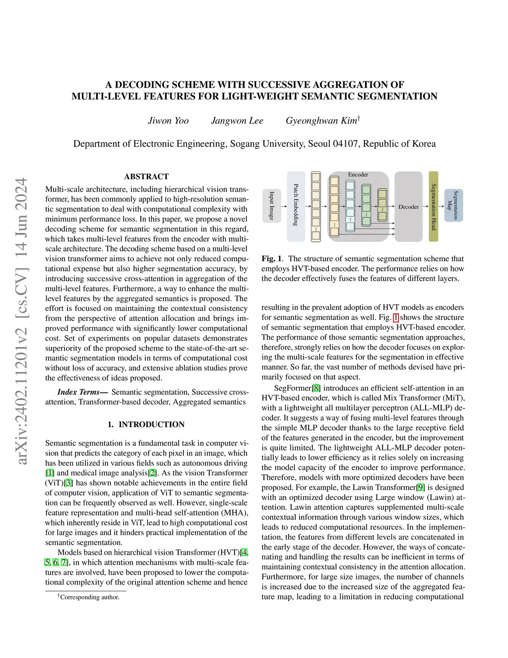 Multi-scale architecture, including hierarchical vision transformer, has been commonly applied to high-resolution semantic segmentation to deal with computational complexity with minimum performance loss. In this paper, we propose a novel decoding scheme for semantic segmentation in this regard, which takes multi-level features from the encoder with multi-scale architecture. The decoding scheme based on a multi-level vision transformer aims to achieve not only reduced computational expense but also higher segmentation accuracy, by introducing successive cross-attention in aggregation of the multi-level features. Furthermore, a way to enhance the multi-level features by the aggregated semantics is proposed. The effort is focused on maintaining the contextual consistency from the perspective of attention allocation and brings improved performance with significantly lower computational cost. Set of experiments on popular datasets demonstrates superiority of the proposed scheme to the state-of-the-art semantic segmentation models in terms of computational cost without loss of accuracy, and extensive ablation studies prove the effectiveness of ideas proposed.