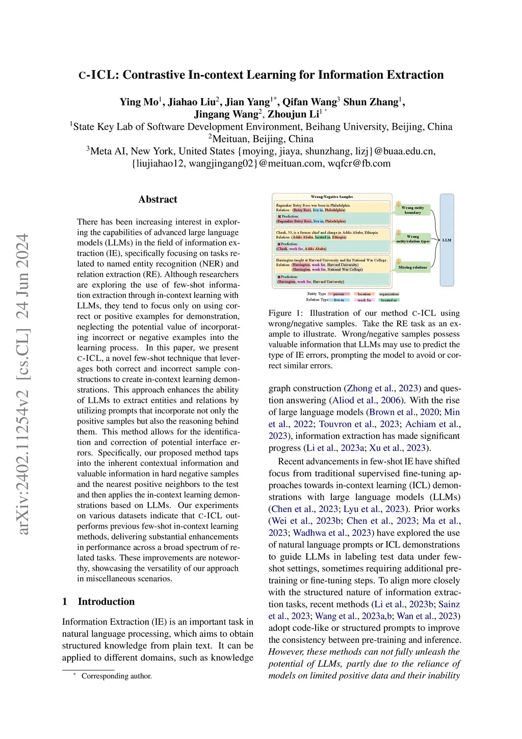 There has been increasing interest in exploring the capabilities of advanced large language models (LLMs) in the field of information extraction (IE), specifically focusing on tasks related to named entity recognition (NER) and relation extraction (RE). Although researchers are exploring the use of few-shot information extraction through in-context learning with LLMs, they tend to focus only on using correct or positive examples for demonstration, neglecting the potential value of incorporating incorrect or negative examples into the learning process. In this paper, we present c-ICL, a novel few-shot technique that leverages both correct and incorrect sample constructions to create in-context learning demonstrations. This approach enhances the ability of LLMs to extract entities and relations by utilizing prompts that incorporate not only the positive samples but also the reasoning behind them. This method allows for the identification and correction of potential interface errors. Specifically, our proposed method taps into the inherent contextual information and valuable information in hard negative samples and the nearest positive neighbors to the test and then applies the in-context learning demonstrations based on LLMs. Our experiments on various datasets indicate that c-ICL outperforms previous few-shot in-context learning methods, delivering substantial enhancements in performance across a broad spectrum of related tasks. These improvements are noteworthy, showcasing the versatility of our approach in miscellaneous scenarios.
