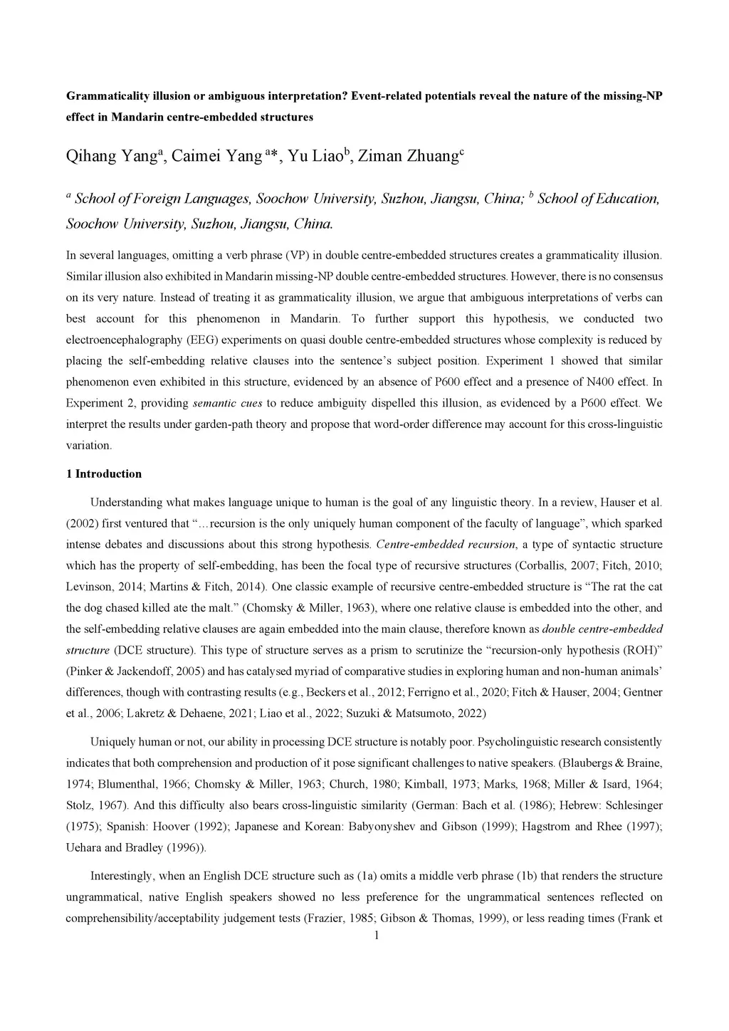 Grammaticality illusion or ambiguous interpretation? Event-related potentials reveal the nature of the missing-NP effect in Mandarin centre-embedded structures