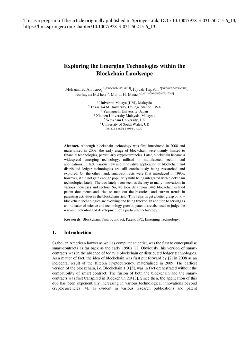 Although blockchain technology was first introduced in 2008 and materialised in 2009, the early usage of blockchain were mainly limited to financial technologies, particularly cryptocurrencies. Later, blockchain became a widespread emerging technology, utilised in multifaceted sectors and applications. In fact, various new and innovative application of blockchain and distributed ledger technologies are still continuously being researched and explored. On the other hand, smart-contracts were first introduced in 1990s, however, it did not gain enough popularity until being integrated with blockchain technologies lately. The duo lately been seen as the key to many innovations in various industries and sectors. So, we took data from 1445 blockchain-related patent documents and tried to map out the historical and current trends in patenting activities in the blockchain field. This helps us get a better grasp of how blockchain technologies are evolving and being tracked. In addition to serving as an indicator of science and technology growth, patents are also used to judge the research potential and development of a particular technology.