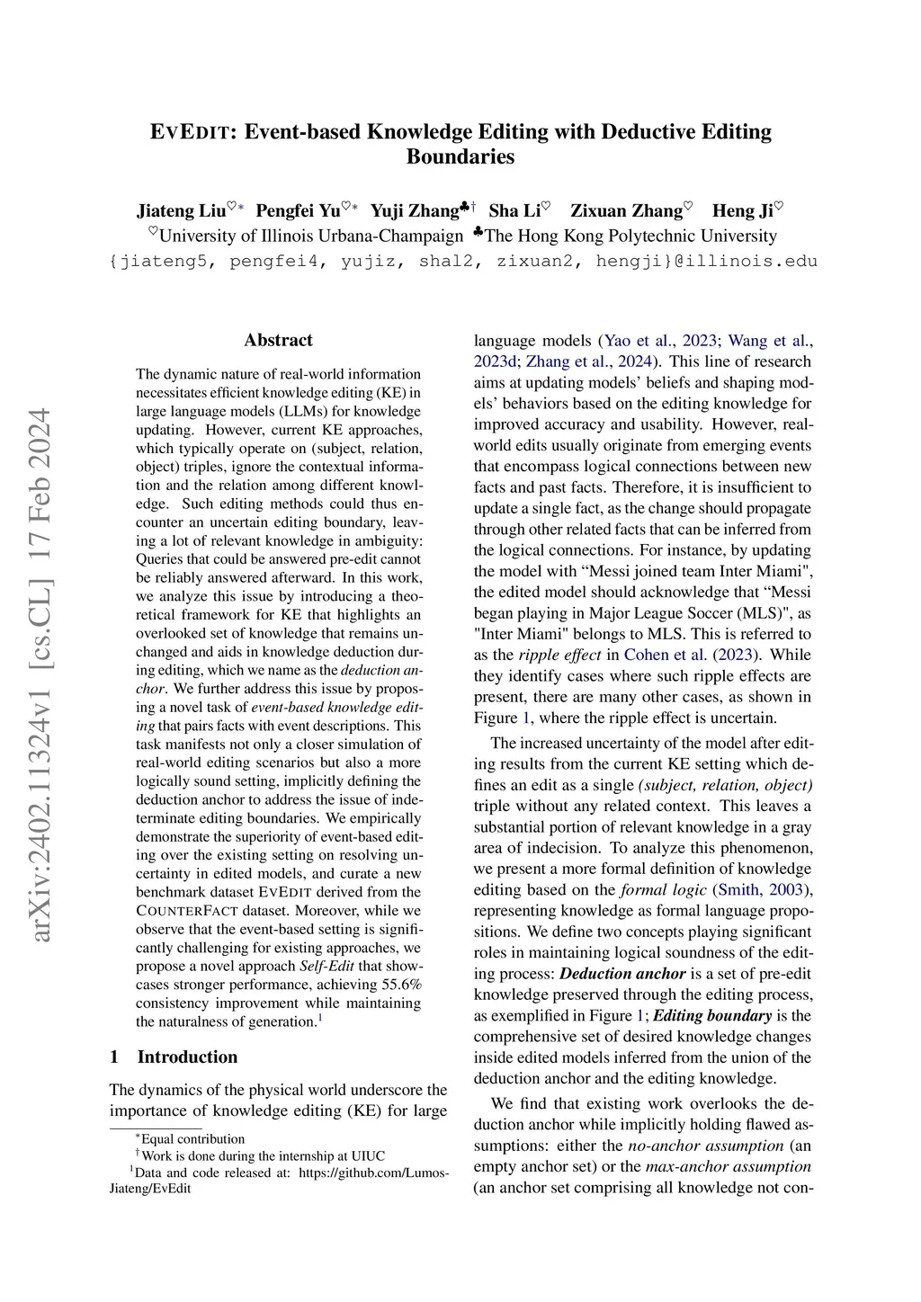 The dynamic nature of real-world information necessitates efficient knowledge editing (KE) in large language models (LLMs) for knowledge updating. However, current KE approaches, which typically operate on (subject, relation, object) triples, ignore the contextual information and the relation among different knowledge. Such editing methods could thus encounter an uncertain editing boundary, leaving a lot of relevant knowledge in ambiguity: Queries that could be answered pre-edit cannot be reliably answered afterward. In this work, we analyze this issue by introducing a theoretical framework for KE that highlights an overlooked set of knowledge that remains unchanged and aids in knowledge deduction during editing, which we name as the deduction anchor. We further address this issue by proposing a novel task of event-based knowledge editing that pairs facts with event descriptions. This task manifests not only a closer simulation of real-world editing scenarios but also a more logically sound setting, implicitly defining the deduction anchor to address the issue of indeterminate editing boundaries. We empirically demonstrate the superiority of event-based editing over the existing setting on resolving uncertainty in edited models, and curate a new benchmark dataset EvEdit derived from the CounterFact dataset. Moreover, while we observe that the event-based setting is significantly challenging for existing approaches, we propose a novel approach Self-Edit that showcases stronger performance, achieving 55.6% consistency improvement while maintaining the naturalness of generation.
