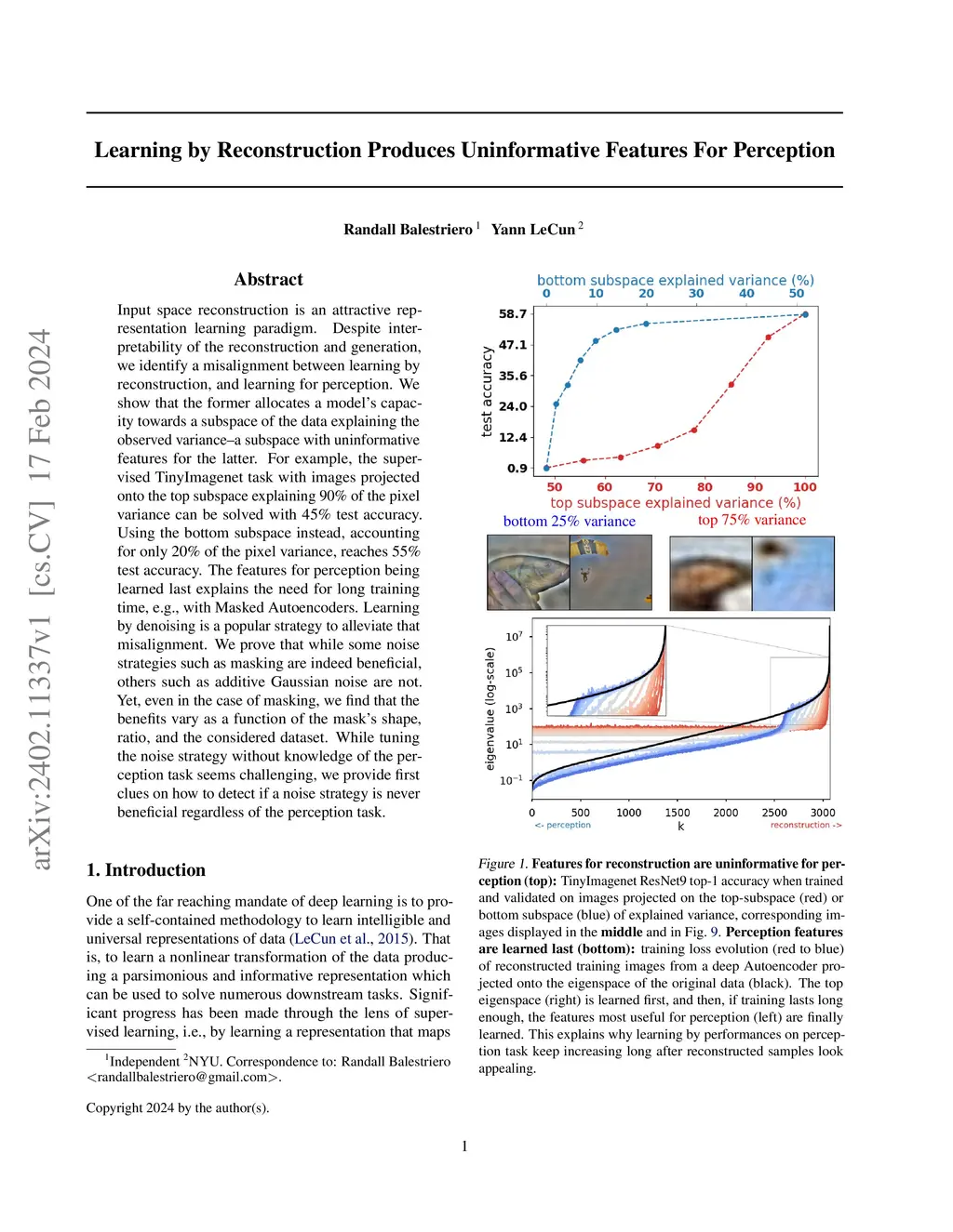 Input space reconstruction is an attractive representation learning paradigm. Despite interpretability of the reconstruction and generation, we identify a misalignment between learning by reconstruction, and learning for perception. We show that the former allocates a model's capacity towards a subspace of the data explaining the observed variance--a subspace with uninformative features for the latter. For example, the supervised TinyImagenet task with images projected onto the top subspace explaining 90\% of the pixel variance can be solved with 45\% test accuracy. Using the bottom subspace instead, accounting for only 20\% of the pixel variance, reaches 55\% test accuracy. The features for perception being learned last explains the need for long training time, e.g., with Masked Autoencoders. Learning by denoising is a popular strategy to alleviate that misalignment. We prove that while some noise strategies such as masking are indeed beneficial, others such as additive Gaussian noise are not. Yet, even in the case of masking, we find that the benefits vary as a function of the mask's shape, ratio, and the considered dataset. While tuning the noise strategy without knowledge of the perception task seems challenging, we provide first clues on how to detect if a noise strategy is never beneficial regardless of the perception task.