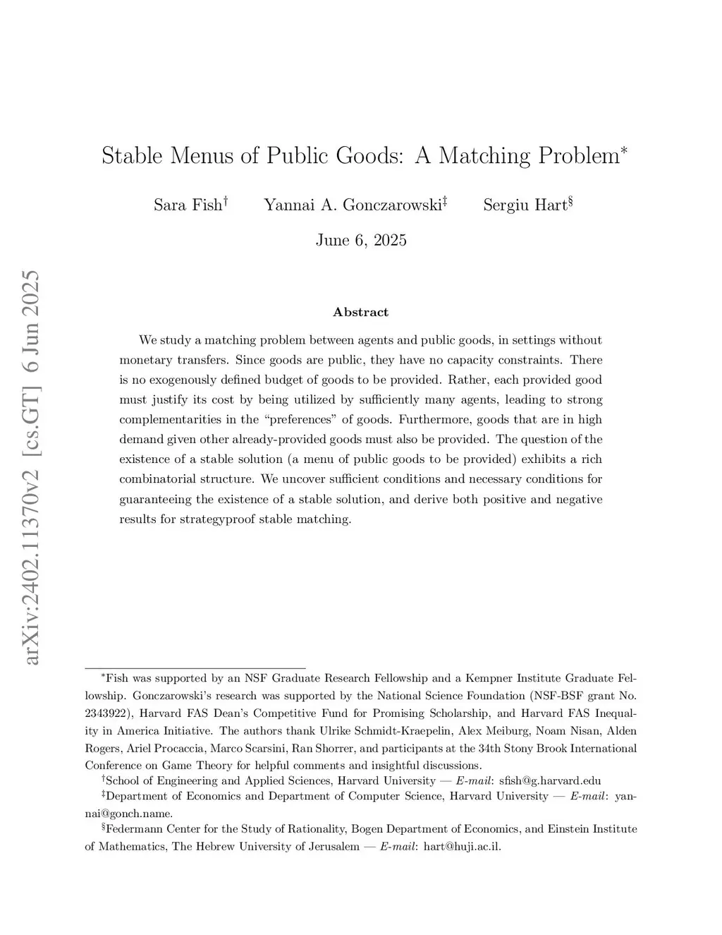 We study a matching problem between agents and public goods, in settings without monetary transfers. Since goods are public, they have no capacity constraints. There is no exogenously defined budget of goods to be provided. Rather, each provided good must justify its cost by being utilized by sufficiently many agents, leading to strong complementarities in the "preferences" of goods. Furthermore, goods that are in high demand given other already-provided goods must also be provided. The question of the existence of a stable solution (a menu of public goods to be provided) exhibits a rich combinatorial structure. We uncover sufficient conditions and necessary conditions for guaranteeing the existence of a stable solution, and derive both positive and negative results for strategyproof stable matching.