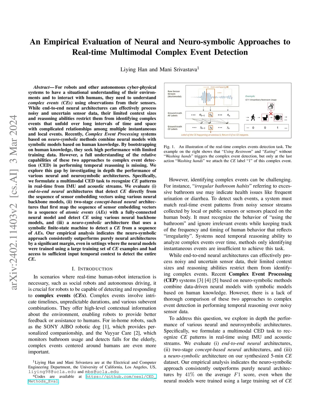 Robots and autonomous systems require an understanding of complex events (CEs) from sensor data to interact with their environments and humans effectively. Traditional end-to-end neural architectures, despite processing sensor data efficiently, struggle with long-duration events due to limited context sizes and reasoning capabilities. Recent advances in neuro-symbolic methods, which integrate neural and symbolic models leveraging human knowledge, promise improved performance with less data. This study addresses the gap in understanding these approaches' effectiveness in complex event detection (CED), especially in temporal reasoning. We investigate neural and neuro-symbolic architectures' performance in a multimodal CED task, analyzing IMU and acoustic data streams to recognize CE patterns. Our methodology includes (i) end-to-end neural architectures for direct CE detection from sensor embeddings, (ii) two-stage concept-based neural models mapping sensor embeddings to atomic events (AEs) before CE detection, and (iii) a neuro-symbolic approach using a symbolic finite-state machine for CE detection from AEs. Empirically, the neuro-symbolic architecture significantly surpasses purely neural models, demonstrating superior performance in CE recognition, even with extensive training data and ample temporal context for neural approaches.