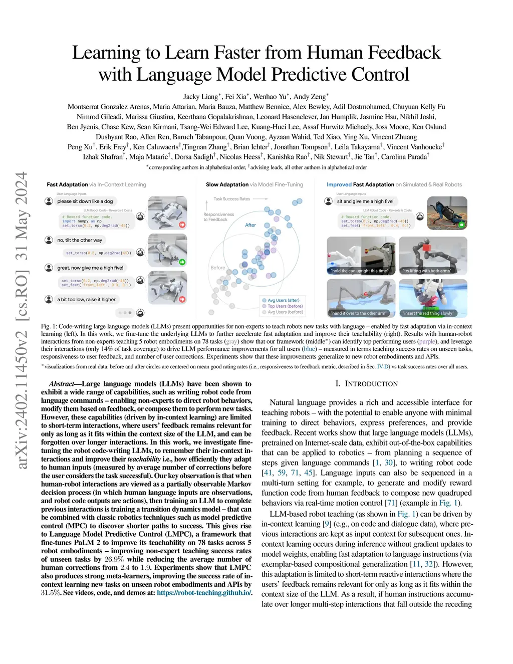 Large language models (LLMs) have been shown to exhibit a wide range of capabilities, such as writing robot code from language commands -- enabling non-experts to direct robot behaviors, modify them based on feedback, or compose them to perform new tasks. However, these capabilities (driven by in-context learning) are limited to short-term interactions, where users' feedback remains relevant for only as long as it fits within the context size of the LLM, and can be forgotten over longer interactions. In this work, we investigate fine-tuning the robot code-writing LLMs, to remember their in-context interactions and improve their teachability i.e., how efficiently they adapt to human inputs (measured by average number of corrections before the user considers the task successful). Our key observation is that when human-robot interactions are viewed as a partially observable Markov decision process (in which human language inputs are observations, and robot code outputs are actions), then training an LLM to complete previous interactions is training a transition dynamics model -- that can be combined with classic robotics techniques such as model predictive control (MPC) to discover shorter paths to success. This gives rise to Language Model Predictive Control (LMPC), a framework that fine-tunes PaLM 2 to improve its teachability on 78 tasks across 5 robot embodiments -- improving non-expert teaching success rates of unseen tasks by 26.9% while reducing the average number of human corrections from 2.4 to 1.9. Experiments show that LMPC also produces strong meta-learners, improving the success rate of in-context learning new tasks on unseen robot embodiments and APIs by 31.5%. See videos, code, and demos at: https://robot-teaching.github.io/.