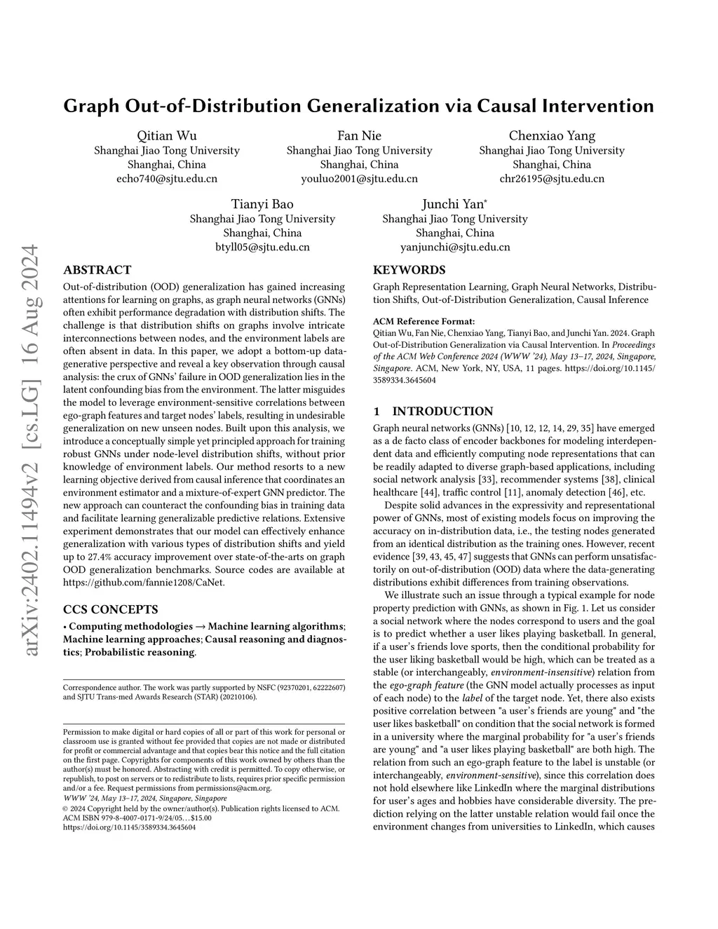 Graph Out-of-Distribution Generalization via Causal Intervention