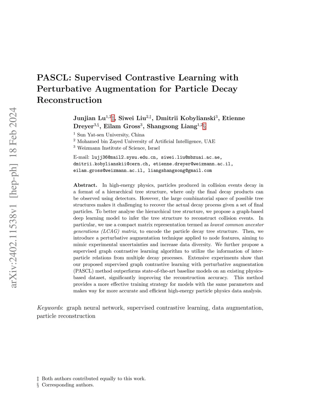 In high-energy physics, particles produced in collision events decay in a format of a hierarchical tree structure, where only the final decay products can be observed using detectors. However, the large combinatorial space of possible tree structures makes it challenging to recover the actual decay process given a set of final particles. To better analyse the hierarchical tree structure, we propose a graph-based deep learning model to infer the tree structure to reconstruct collision events. In particular, we use a compact matrix representation termed as lowest common ancestor generations (LCAG) matrix, to encode the particle decay tree structure. Then, we introduce a perturbative augmentation technique applied to node features, aiming to mimic experimental uncertainties and increase data diversity. We further propose a supervised graph contrastive learning algorithm to utilize the information of inter-particle relations from multiple decay processes. Extensive experiments show that our proposed supervised graph contrastive learning with perturbative augmentation (PASCL) method outperforms state-of-the-art baseline models on an existing physics-based dataset, significantly improving the reconstruction accuracy. This method provides a more effective training strategy for models with the same parameters and makes way for more accurate and efficient high-energy particle physics data analysis.