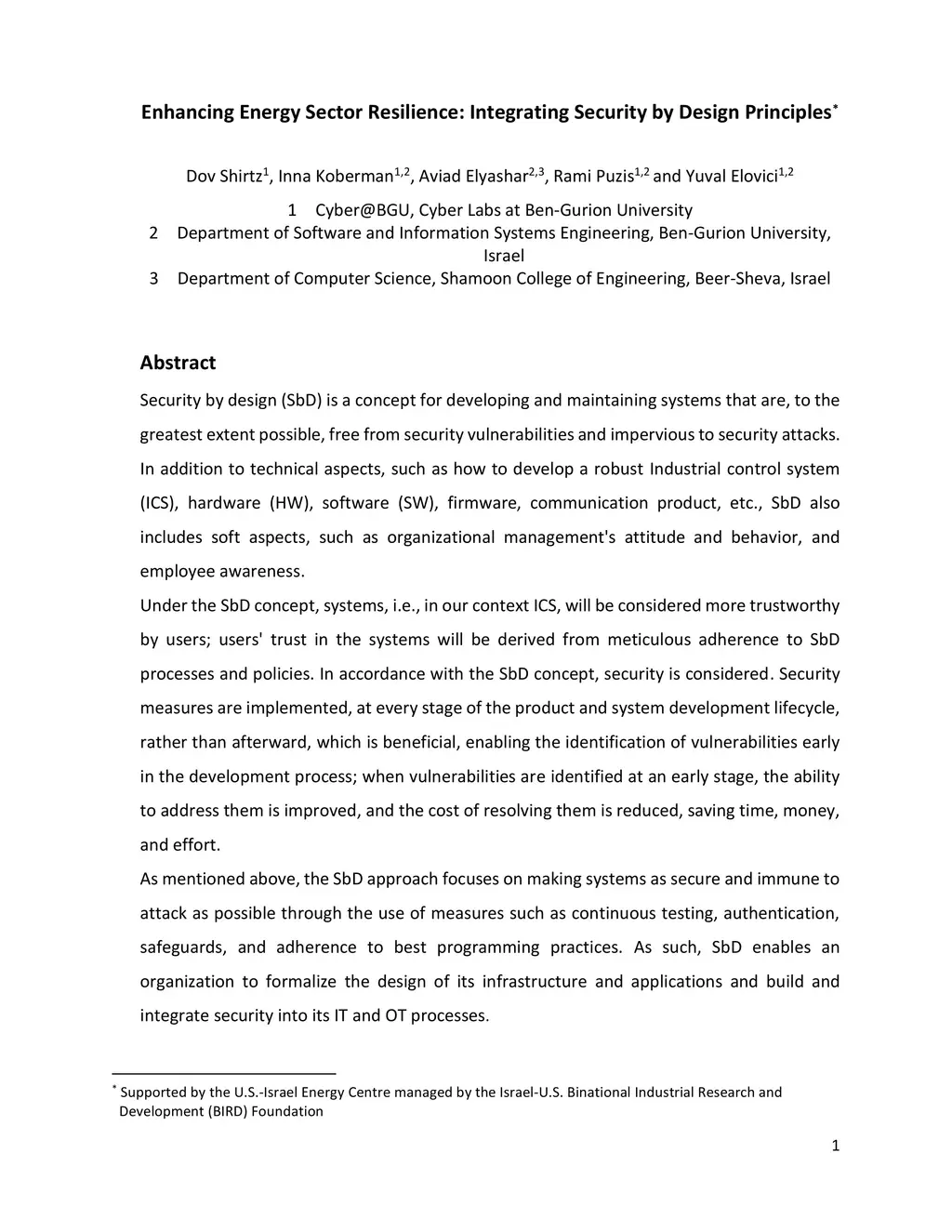 Security by design, Sbd is a concept for developing and maintaining systems that are, to the greatest extent possible, free from security vulnerabilities and impervious to security attacks. In addition to technical aspects, such as how to develop a robust industrial control systems hardware, software, communication product, etc., SbD includes also soft aspects, such as organizational managerial attitude and behavior, and employee awareness. Under the Sbd concept, systems, ICS in our context, will be considered more trustworthy by users. User's trust in the systems will be derived from the meticulous adherence to the SbD processes and policies. In accordance with the SbD concept, security is considered. Security measures are implemented, at every stage of the product and systems development life cycle, rather than afterwards. This document presents the security requirements for the implementation of the SbD in industrial control systems. The information presented does not negate any existing security and cyber security standards, etc. Instead, we strongly recommend that organizations should implement and comply with those standards and best practices. Security by design is not a one-time process. It starts at the very beginning of the products of the system design and continues through all its lifecycle. Due to the benefits of the SbD, higher level of security, and robustness to cyber attacks, all organizations associated with the energy sector should strive to establish an ecosystem. The requirements presented in this document may be perceived as burdensome by organizations. However, strict compliance with the requirements and existing security standards and best practices, including continuous monitoring, as specified in this document, is essential to realize an ecosystem driven and protected by the SbD