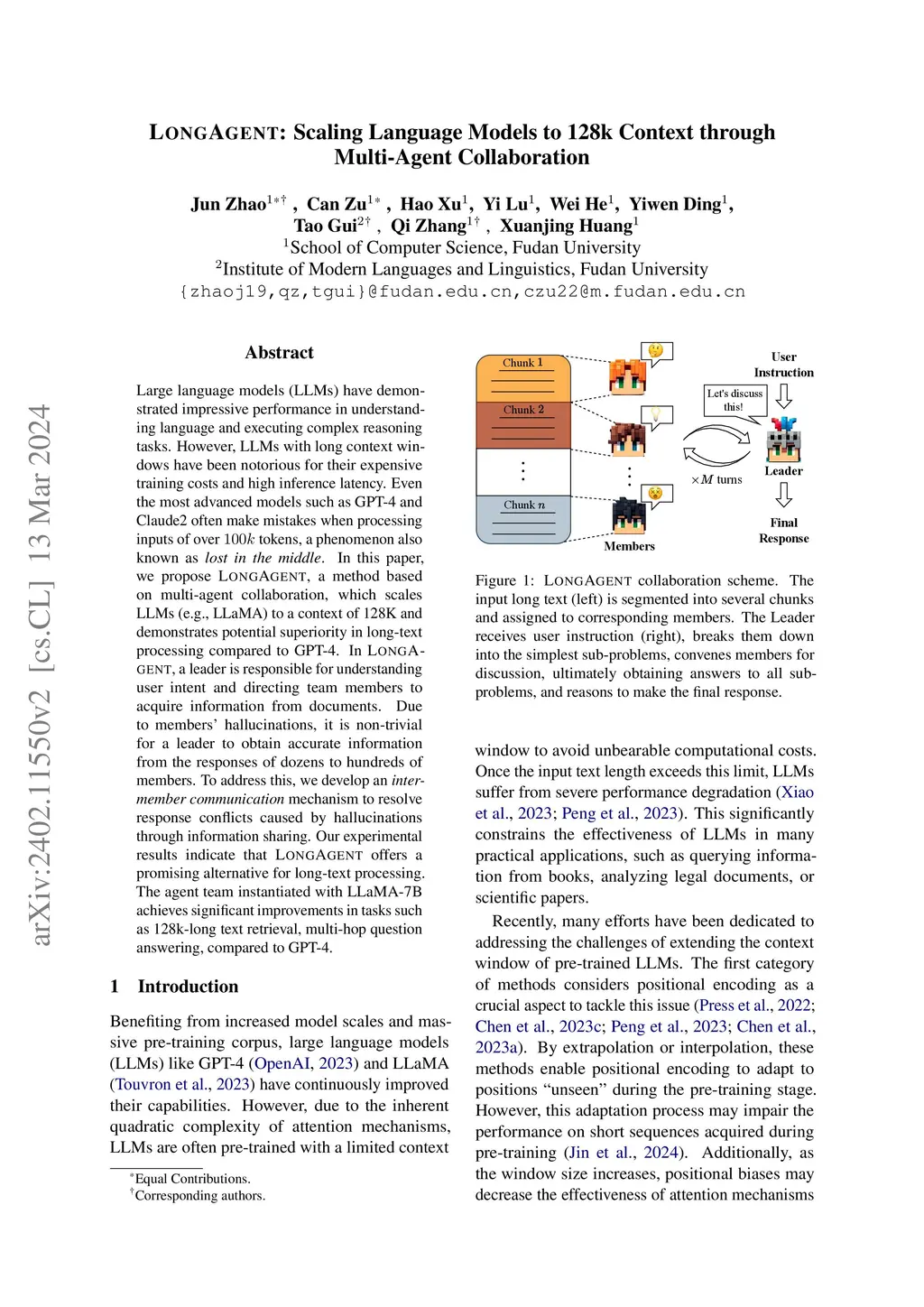 Large language models (LLMs) have demonstrated impressive performance in understanding language and executing complex reasoning tasks. However, LLMs with long context windows have been notorious for their expensive training costs and high inference latency. Even the most advanced models such as GPT-4 and Claude2 often make mistakes when processing inputs of over tokens, a phenomenon also known as \textit{lost in the middle}. In this paper, we propose \textsc{LongAgent}, a method based on multi-agent collaboration, which scales LLMs (e.g., LLaMA) to a context of 128K and demonstrates potential superiority in long-text processing compared to GPT-4. In \textsc{LongAgent}, a leader is responsible for understanding user intent and directing team members to acquire information from documents. Due to members' hallucinations, it is non-trivial for a leader to obtain accurate information from the responses of dozens to hundreds of members. To address this, we develop an \textit{inter-member communication} mechanism to resolve response conflicts caused by hallucinations through information sharing. Our experimental results indicate that \textsc{LongAgent} offers a promising alternative for long-text processing. The agent team instantiated with LLaMA-7B achieves significant improvements in tasks such as 128k-long text retrieval, multi-hop question answering, compared to GPT-4.