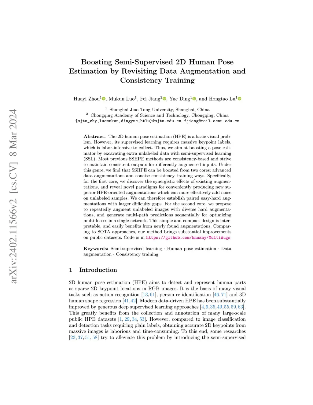 The 2D human pose estimation (HPE) is a basic visual problem. However, its supervised learning requires massive keypoint labels, which is labor-intensive to collect. Thus, we aim at boosting a pose estimator by excavating extra unlabeled data with semi-supervised learning (SSL). Most previous SSHPE methods are consistency-based and strive to maintain consistent outputs for differently augmented inputs. Under this genre, we find that SSHPE can be boosted from two cores: advanced data augmentations and concise consistency training ways. Specifically, for the first core, we discover the synergistic effects of existing augmentations, and reveal novel paradigms for conveniently producing new superior HPE-oriented augmentations which can more effectively add noise on unlabeled samples. We can therefore establish paired easy-hard augmentations with larger difficulty gaps. For the second core, we propose to repeatedly augment unlabeled images with diverse hard augmentations, and generate multi-path predictions sequentially for optimizing multi-losses in a single network. This simple and compact design is interpretable, and easily benefits from newly found augmentations. Comparing to state-of-the-art SSL approaches, our method brings substantial improvements on public datasets. And we extensively validate the superiority and versatility of our approach on conventional human body images, overhead fisheye images, and human hand images. The code is released inthis https URL.