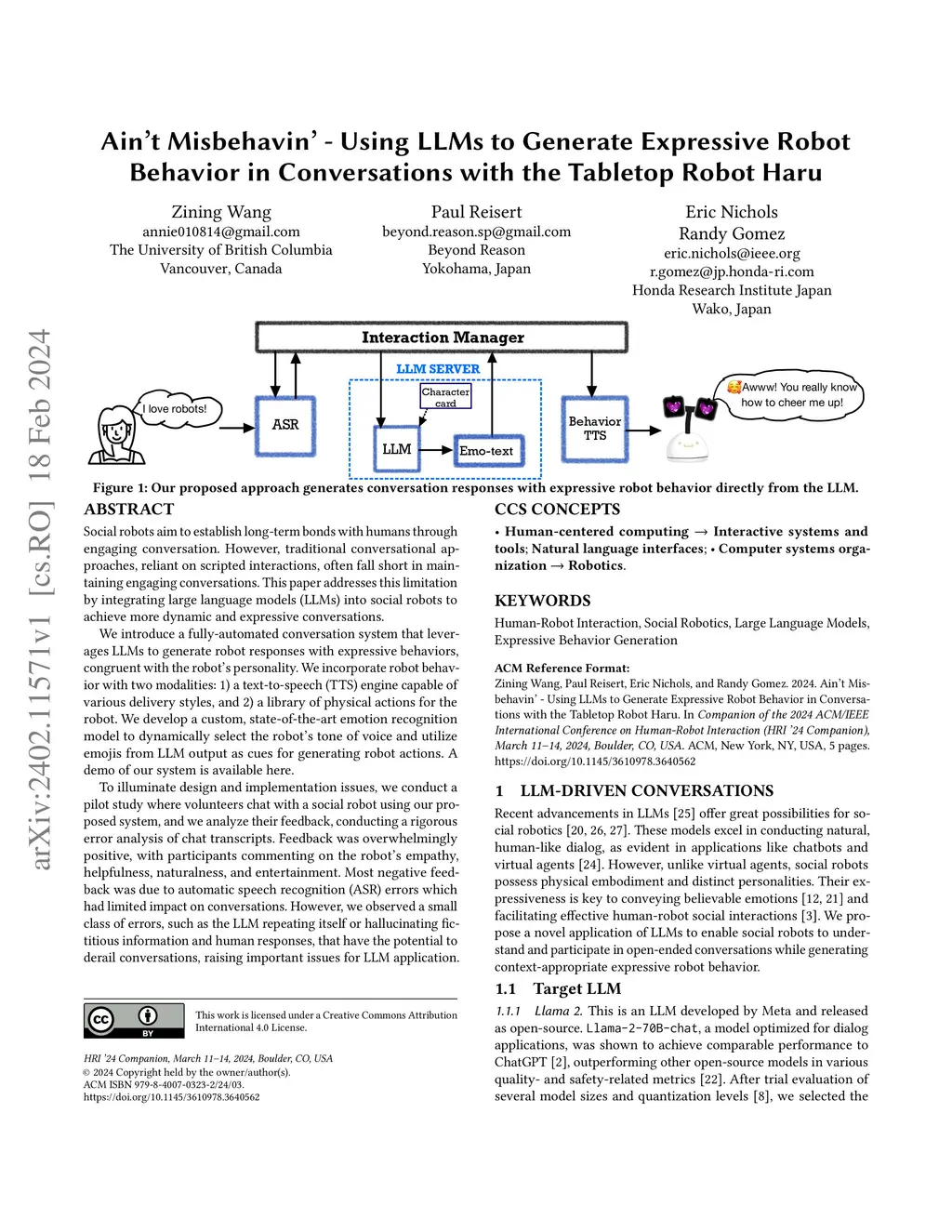 Social robots aim to establish long-term bonds with humans through engaging conversation. However, traditional conversational approaches, reliant on scripted interactions, often fall short in maintaining engaging conversations. This paper addresses this limitation by integrating large language models (LLMs) into social robots to achieve more dynamic and expressive conversations. We introduce a fully-automated conversation system that leverages LLMs to generate robot responses with expressive behaviors, congruent with the robot's personality. We incorporate robot behavior with two modalities: 1) a text-to-speech (TTS) engine capable of various delivery styles, and 2) a library of physical actions for the robot. We develop a custom, state-of-the-art emotion recognition model to dynamically select the robot's tone of voice and utilize emojis from LLM output as cues for generating robot actions. A demo of our system is available here. To illuminate design and implementation issues, we conduct a pilot study where volunteers chat with a social robot using our proposed system, and we analyze their feedback, conducting a rigorous error analysis of chat transcripts. Feedback was overwhelmingly positive, with participants commenting on the robot's empathy, helpfulness, naturalness, and entertainment. Most negative feedback was due to automatic speech recognition (ASR) errors which had limited impact on conversations. However, we observed a small class of errors, such as the LLM repeating itself or hallucinating fictitious information and human responses, that have the potential to derail conversations, raising important issues for LLM application.