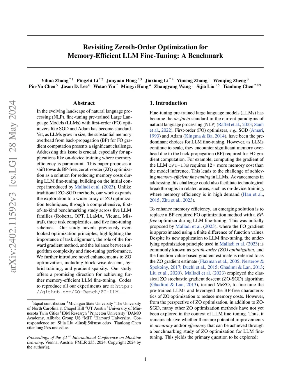 In the evolving landscape of natural language processing (NLP), fine-tuning pre-trained Large Language Models (LLMs) with first-order (FO) optimizers like SGD and Adam has become standard. Yet, as LLMs grow {in size}, the substantial memory overhead from back-propagation (BP) for FO gradient computation presents a significant challenge. Addressing this issue is crucial, especially for applications like on-device training where memory efficiency is paramount. This paper proposes a shift towards BP-free, zeroth-order (ZO) optimization as a solution for reducing memory costs during LLM fine-tuning, building on the initial concept introduced by MeZO. Unlike traditional ZO-SGD methods, our work expands the exploration to a wider array of ZO optimization techniques, through a comprehensive, first-of-its-kind benchmarking study across five LLM families (Roberta, OPT, LLaMA, Vicuna, Mistral), three task complexities, and five fine-tuning schemes. Our study unveils previously overlooked optimization principles, highlighting the importance of task alignment, the role of the forward gradient method, and the balance between algorithm complexity and fine-tuning performance. We further introduce novel enhancements to ZO optimization, including block-wise descent, hybrid training, and gradient sparsity. Our study offers a promising direction for achieving further memory-efficient LLM fine-tuning. Codes to reproduce all our experiments are at https://github.com/ZO-Bench/ZO-LLM .