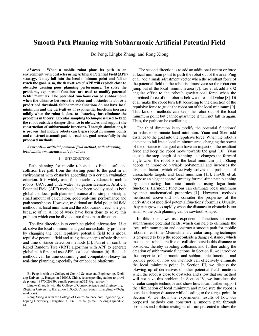 When a mobile robot plans its path in an environment with obstacles using Artificial Potential Field (APF) strategy, it may fall into the local minimum point and fail to reach the goal. Also, the derivatives of APF will explode close to obstacles causing poor planning performance. To solve the problems, exponential functions are used to modify potential fields' formulas. The potential functions can be subharmonic when the distance between the robot and obstacles is above a predefined threshold. Subharmonic functions do not have local minimum and the derivatives of exponential functions increase mildly when the robot is close to obstacles, thus eliminate the problems in theory. Circular sampling technique is used to keep the robot outside a danger distance to obstacles and support the construction of subharmonic functions. Through simulations, it is proven that mobile robots can bypass local minimum points and construct a smooth path to reach the goal successfully by the proposed methods.
