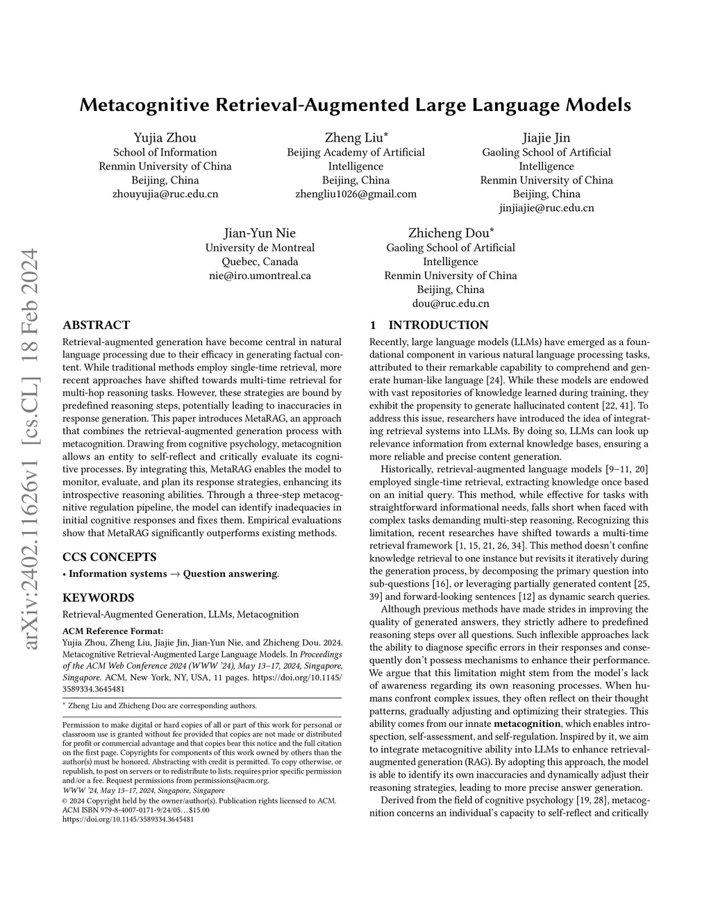 Retrieval-augmented generation have become central in natural language processing due to their efficacy in generating factual content. While traditional methods employ single-time retrieval, more recent approaches have shifted towards multi-time retrieval for multi-hop reasoning tasks. However, these strategies are bound by predefined reasoning steps, potentially leading to inaccuracies in response generation. This paper introduces MetaRAG, an approach that combines the retrieval-augmented generation process with metacognition. Drawing from cognitive psychology, metacognition allows an entity to self-reflect and critically evaluate its cognitive processes. By integrating this, MetaRAG enables the model to monitor, evaluate, and plan its response strategies, enhancing its introspective reasoning abilities. Through a three-step metacognitive regulation pipeline, the model can identify inadequacies in initial cognitive responses and fixes them. Empirical evaluations show that MetaRAG significantly outperforms existing methods.