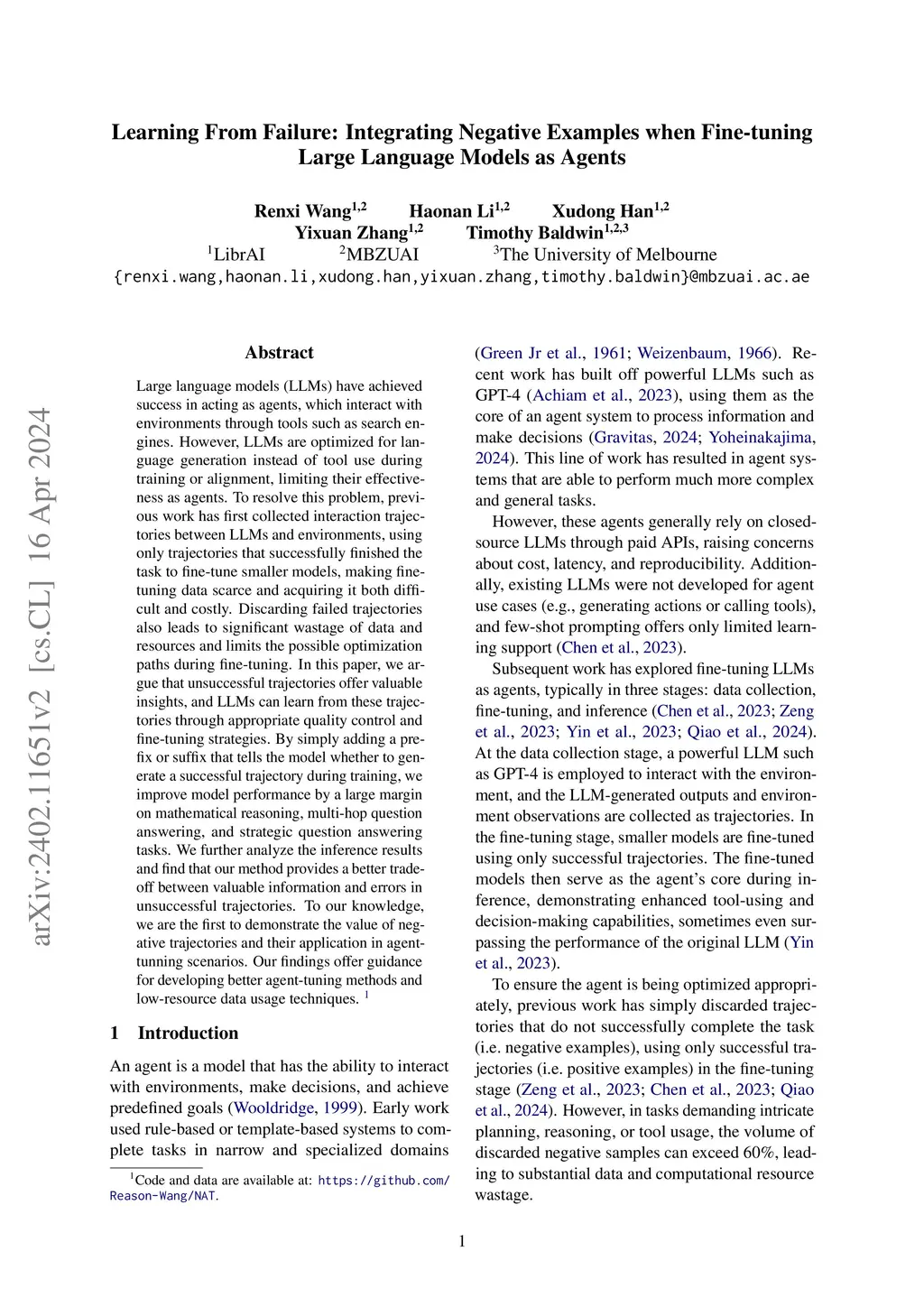 Large language models (LLMs) have achieved success in acting as agents, which interact with environments through tools such as search engines. However, LLMs are optimized for language generation instead of tool use during training or alignment, limiting their effectiveness as agents. To resolve this problem, previous work has first collected interaction trajectories between LLMs and environments, using only trajectories that successfully finished the task to fine-tune smaller models, making fine-tuning data scarce and acquiring it both difficult and costly. Discarding failed trajectories also leads to significant wastage of data and resources and limits the possible optimization paths during fine-tuning. In this paper, we argue that unsuccessful trajectories offer valuable insights, and LLMs can learn from these trajectories through appropriate quality control and fine-tuning strategies. By simply adding a prefix or suffix that tells the model whether to generate a successful trajectory during training, we improve model performance by a large margin on mathematical reasoning, multi-hop question answering, and strategic question answering tasks. We further analyze the inference results and find that our method provides a better trade-off between valuable information and errors in unsuccessful trajectories. To our knowledge, we are the first to demonstrate the value of negative trajectories and their application in agent-tunning scenarios. Our findings offer guidance for developing better agent-tuning methods and low-resource data usage techniques.