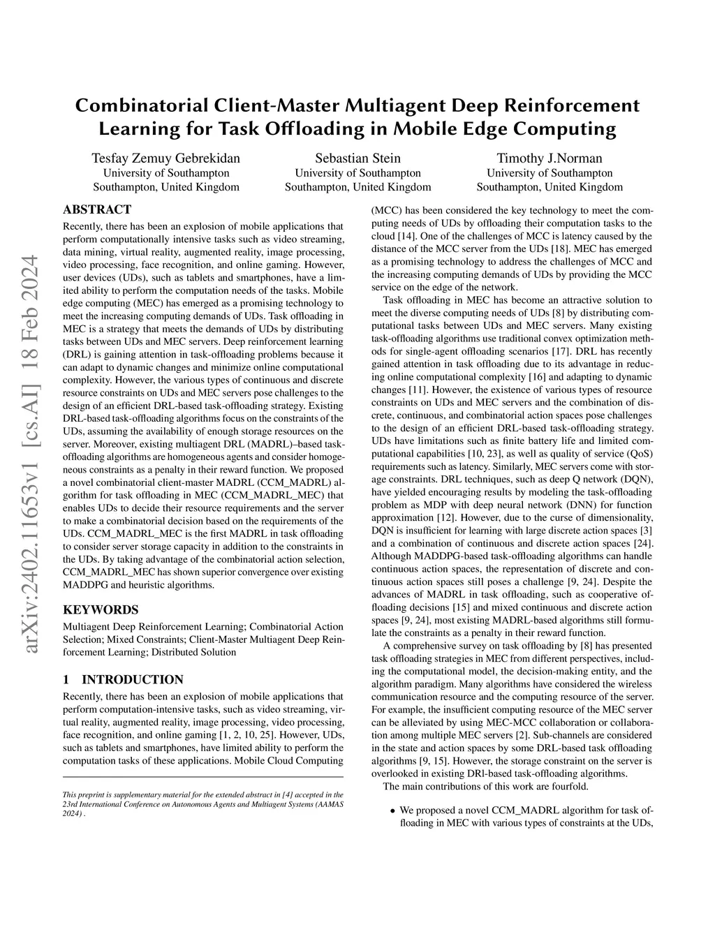 Recently, there has been an explosion of mobile applications that perform computationally intensive tasks such as video streaming, data mining, virtual reality, augmented reality, image processing, video processing, face recognition, and online gaming. However, user devices (UDs), such as tablets and smartphones, have a limited ability to perform the computation needs of the tasks. Mobile edge computing (MEC) has emerged as a promising technology to meet the increasing computing demands of UDs. Task offloading in MEC is a strategy that meets the demands of UDs by distributing tasks between UDs and MEC servers. Deep reinforcement learning (DRL) is gaining attention in task-offloading problems because it can adapt to dynamic changes and minimize online computational complexity. However, the various types of continuous and discrete resource constraints on UDs and MEC servers pose challenges to the design of an efficient DRL-based task-offloading strategy. Existing DRL-based task-offloading algorithms focus on the constraints of the UDs, assuming the availability of enough storage resources on the server. Moreover, existing multiagent DRL (MADRL)--based task-offloading algorithms are homogeneous agents and consider homogeneous constraints as a penalty in their reward function. We proposed a novel combinatorial client-master MADRL (CCM\_MADRL) algorithm for task offloading in MEC (CCM\_MADRL\_MEC) that enables UDs to decide their resource requirements and the server to make a combinatorial decision based on the requirements of the UDs. CCM\_MADRL\_MEC is the first MADRL in task offloading to consider server storage capacity in addition to the constraints in the UDs. By taking advantage of the combinatorial action selection, CCM\_MADRL\_MEC has shown superior convergence over existing MADDPG and heuristic algorithms.