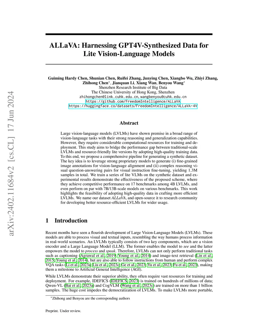Large vision-language models (LVLMs) have shown premise in a broad range of vision-language tasks with their strong reasoning and generalization capabilities. However, they require considerable computational resources for training and deployment. This study aims to bridge the performance gap between traditional-scale LVLMs and resource-friendly lite versions by adopting high-quality training data. To this end, we propose a comprehensive pipeline for generating a synthetic dataset. The key idea is to leverage strong proprietary models to generate (i) fine-grained image annotations for vision-language alignment and (ii) complex reasoning visual question-answering pairs for visual instruction fine-tuning, yielding 1.3M samples in total. We train a series of lite VLMs on the synthetic dataset and experimental results demonstrate the effectiveness of the proposed scheme, where they achieve competitive performance on 17 benchmarks among 4B LVLMs, and even perform on par with 7B/13B-scale models on various benchmarks. This work highlights the feasibility of adopting high-quality data in crafting more efficient LVLMs. We name our dataset \textit{ALLaVA}, and open-source it to research community for developing better resource-efficient LVLMs for wider usage.