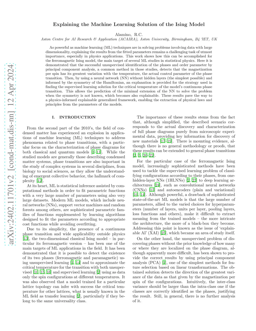 As powerful as machine learning (ML) techniques are in solving problems involving data with large dimensionality, explaining the results from the fitted parameters remains a challenging task of utmost importance, especially in physics applications. This work shows how this can be accomplished for the ferromagnetic Ising model, the main target of several ML studies in statistical physics. Here it is demonstrated that the successful unsupervised identification of the phases and order parameter by principal component analysis, a common method in those studies, detects that the magnetization per spin has its greatest variation with the temperature, the actual control parameter of the phase transition. Then, by using a neural network (NN) without hidden layers (the simplest possible) and informed by the symmetry of the Hamiltonian, an explanation is provided for the strategy used in finding the supervised learning solution for the critical temperature of the model's continuous phase transition. This allows the prediction of the minimal extension of the NN to solve the problem when the symmetry is not known, which becomes also explainable. These results pave the way to a physics-informed explainable generalized framework, enabling the extraction of physical laws and principles from the parameters of the models.