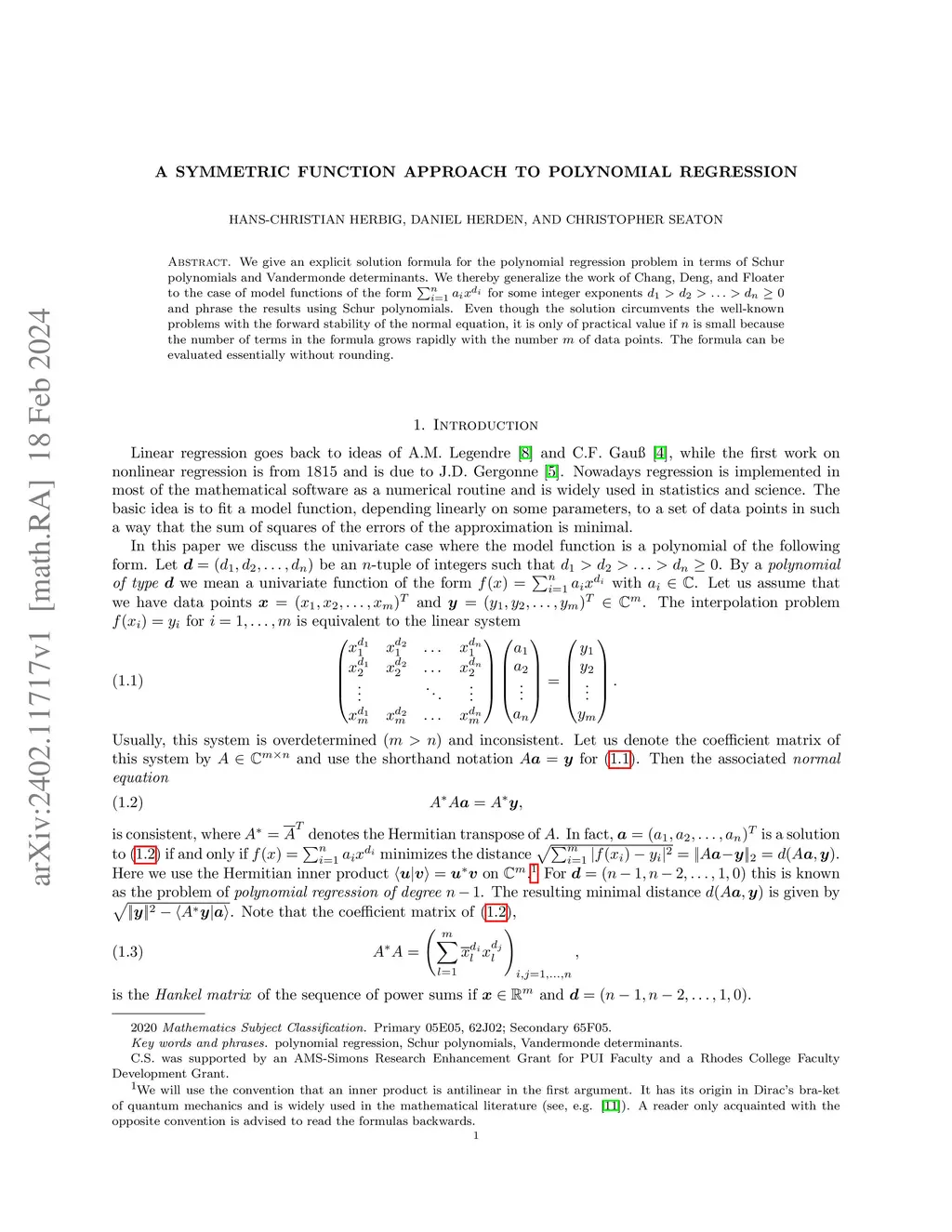 We give an explicit solution formula for the polynomial regression problem in terms of Schur polynomials and Vandermonde determinants. We thereby generalize the work of Chang, Deng, and Floater to the case of model functions of the form for some integer exponents and phrase the results using Schur polynomials. Even though the solution circumvents the well-known problems with the forward stability of the normal equation, it is only of practical value if is small because the number of terms in the formula grows rapidly with the number of data points. The formula can be evaluated essentially without rounding.
