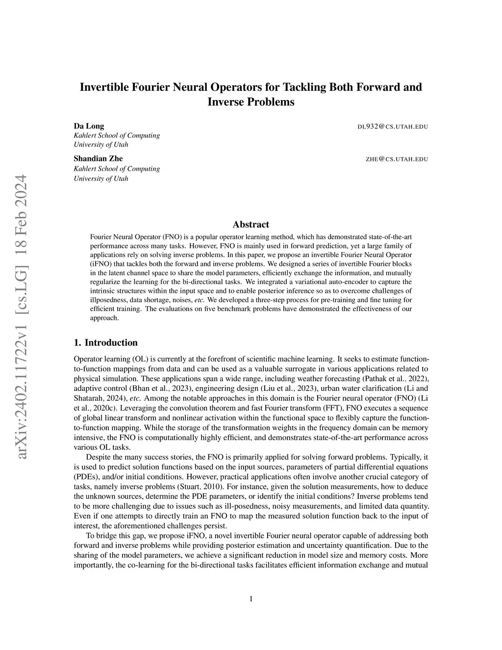 Fourier Neural Operator (FNO) is a powerful and popular operator learning method. However, FNO is mainly used in forward prediction, yet a great many applications rely on solving inverse problems. In this paper, we propose an invertible Fourier Neural Operator (iFNO) for jointly tackling the forward and inverse problems. We developed a series of invertible Fourier blocks in the latent channel space to share the model parameters, exchange the information, and mutually regularize the learning for the bi-directional tasks. We integrated a variational auto-encoder to capture the intrinsic structures within the input space and to enable posterior inference so as to mitigate challenges of illposedness, data shortage, noises that are common in inverse problems. We proposed a three-step process to combine the invertible blocks and the VAE component for effective training. The evaluations on seven benchmark forward and inverse tasks have demonstrated the advantages of our approach.