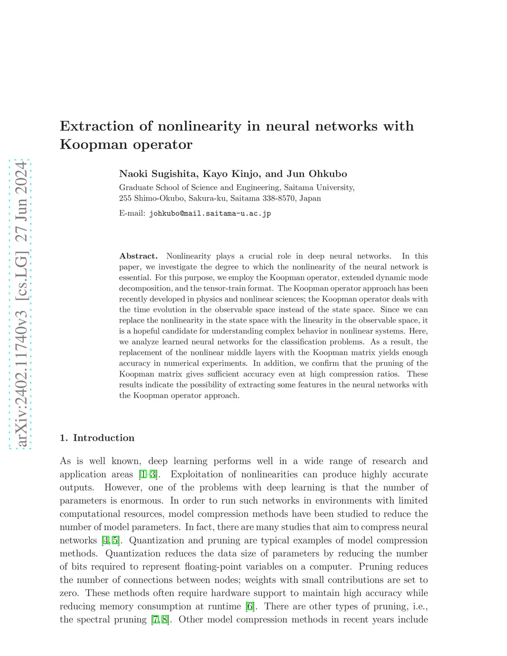 Nonlinearity plays a crucial role in deep neural networks. In this paper, we investigate the degree to which the nonlinearity of the neural network is essential. For this purpose, we employ the Koopman operator, extended dynamic mode decomposition, and the tensor-train format. The Koopman operator approach has been recently developed in physics and nonlinear sciences; the Koopman operator deals with the time evolution in the observable space instead of the state space. Since we can replace the nonlinearity in the state space with the linearity in the observable space, it is a hopeful candidate for understanding complex behavior in nonlinear systems. Here, we analyze learned neural networks for the classification problems. As a result, the replacement of the nonlinear middle layers with the Koopman matrix yields enough accuracy in numerical experiments. In addition, we confirm that the pruning of the Koopman matrix gives sufficient accuracy even at high compression ratios. These results indicate the possibility of extracting some features in the neural networks with the Koopman operator approach.