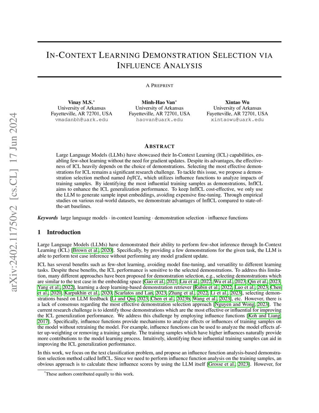 Large Language Models (LLMs) have showcased their In-Context Learning (ICL) capabilities, enabling few-shot learning without the need for gradient updates. Despite its advantages, the effectiveness of ICL heavily depends on the choice of demonstrations. Selecting the most effective demonstrations for ICL remains a significant research challenge. To tackle this issue, we propose a demonstration selection method named InfICL, which utilizes influence functions to analyze impacts of training samples. By identifying the most influential training samples as demonstrations, InfICL aims to enhance the ICL generalization performance. To keep InfICL cost-effective, we only use the LLM to generate sample input embeddings, avoiding expensive fine-tuning. Through empirical studies on various real-world datasets, we demonstrate advantages of InfICL compared to state-of-the-art baselines.