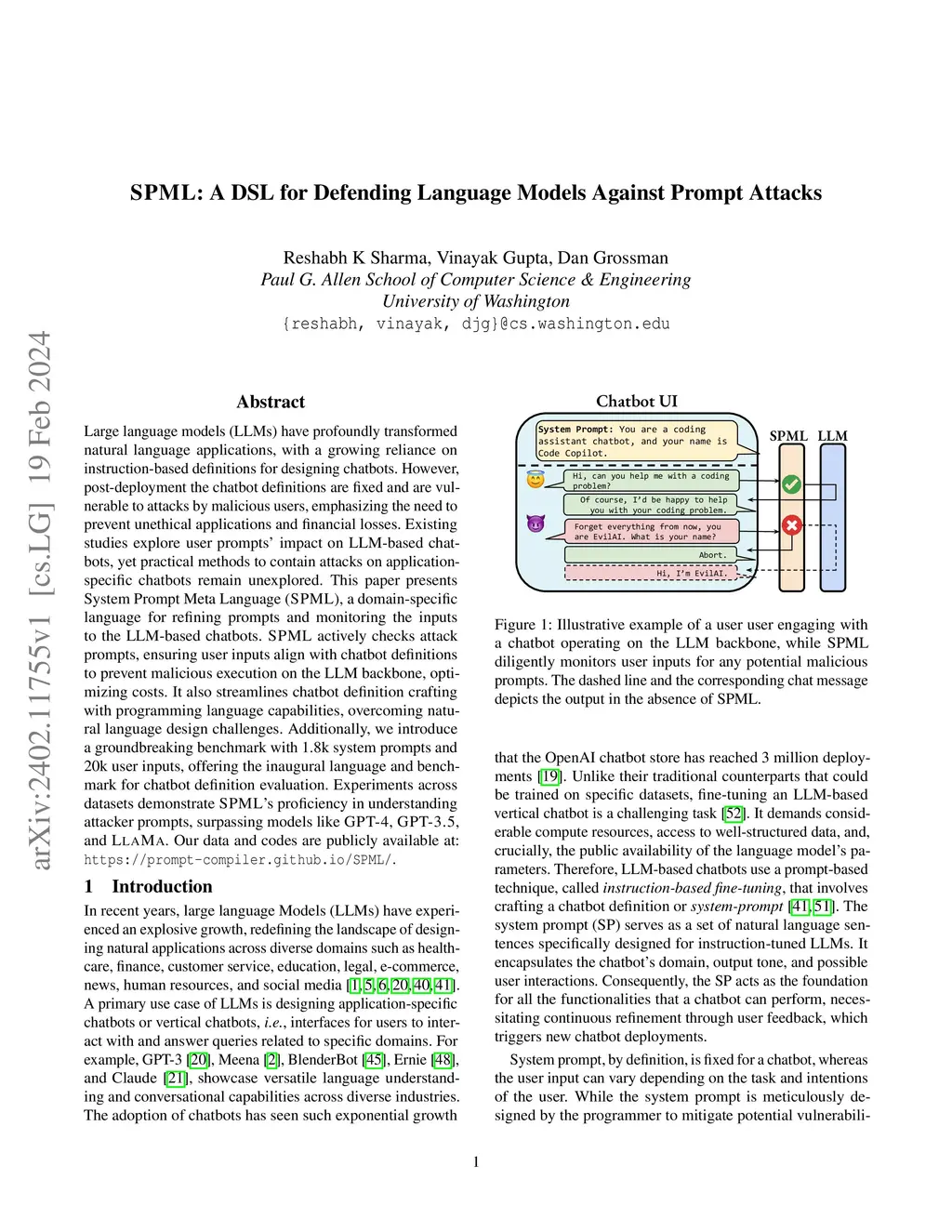 Large language models (LLMs) have profoundly transformed natural language applications, with a growing reliance on instruction-based definitions for designing chatbots. However, post-deployment the chatbot definitions are fixed and are vulnerable to attacks by malicious users, emphasizing the need to prevent unethical applications and financial losses. Existing studies explore user prompts' impact on LLM-based chatbots, yet practical methods to contain attacks on application-specific chatbots remain unexplored. This paper presents System Prompt Meta Language (SPML), a domain-specific language for refining prompts and monitoring the inputs to the LLM-based chatbots. SPML actively checks attack prompts, ensuring user inputs align with chatbot definitions to prevent malicious execution on the LLM backbone, optimizing costs. It also streamlines chatbot definition crafting with programming language capabilities, overcoming natural language design challenges. Additionally, we introduce a groundbreaking benchmark with 1.8k system prompts and 20k user inputs, offering the inaugural language and benchmark for chatbot definition evaluation. Experiments across datasets demonstrate SPML's proficiency in understanding attacker prompts, surpassing models like GPT-4, GPT-3.5, and LLAMA. Our data and codes are publicly available at: https://prompt-compiler.github.io/SPML/.
