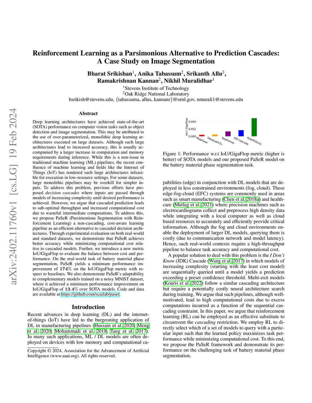 Deep learning architectures have achieved state-of-the-art (SOTA) performance on computer vision tasks such as object detection and image segmentation. This may be attributed to the use of over-parameterized, monolithic deep learning architectures executed on large datasets. Although such architectures lead to increased accuracy, this is usually accompanied by a large increase in computation and memory requirements during inference. While this is a non-issue in traditional machine learning pipelines, the recent confluence of machine learning and fields like the Internet of Things has rendered such large architectures infeasible for execution in low-resource settings. In such settings, previous efforts have proposed decision cascades where inputs are passed through models of increasing complexity until desired performance is achieved. However, we argue that cascaded prediction leads to increased computational cost due to wasteful intermediate computations. To address this, we propose PaSeR (Parsimonious Segmentation with Reinforcement Learning) a non-cascading, cost-aware learning pipeline as an alternative to cascaded architectures. Through experimental evaluation on real-world and standard datasets, we demonstrate that PaSeR achieves better accuracy while minimizing computational cost relative to cascaded models. Further, we introduce a new metric IoU/GigaFlop to evaluate the balance between cost and performance. On the real-world task of battery material phase segmentation, PaSeR yields a minimum performance improvement of 174% on the IoU/GigaFlop metric with respect to baselines. We also demonstrate PaSeR's adaptability to complementary models trained on a noisy MNIST dataset, where it achieved a minimum performance improvement on IoU/GigaFlop of 13.4% over SOTA models. Code and data are available at https://github.com/scailab/paser .