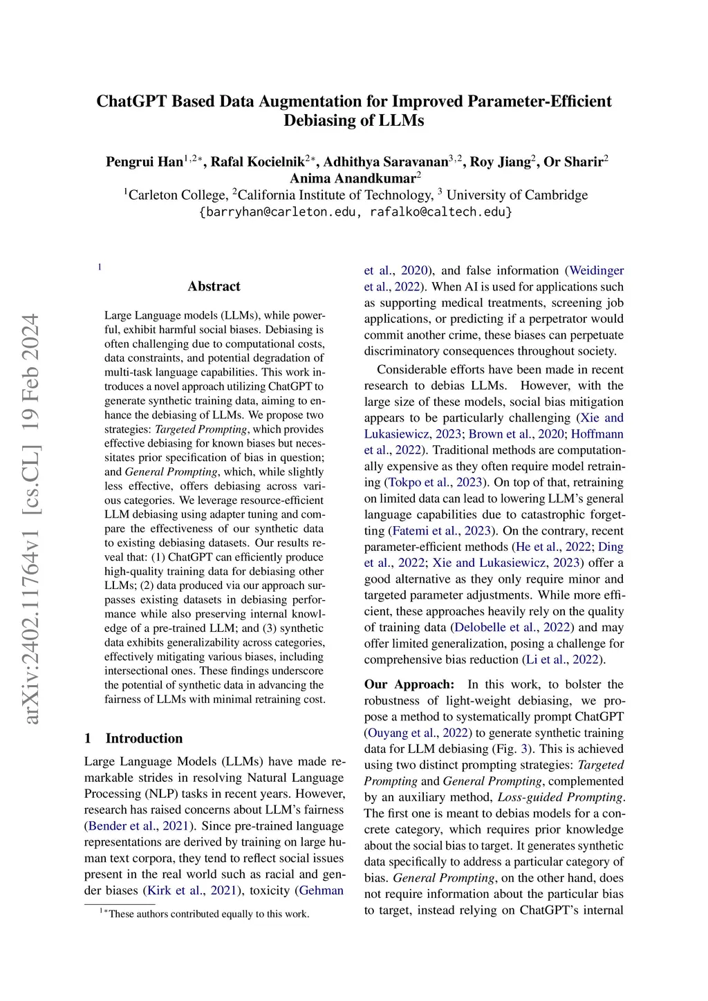 Large Language models (LLMs), while powerful, exhibit harmful social biases. Debiasing is often challenging due to computational costs, data constraints, and potential degradation of multi-task language capabilities. This work introduces a novel approach utilizing ChatGPT to generate synthetic training data, aiming to enhance the debiasing of LLMs. We propose two strategies: Targeted Prompting, which provides effective debiasing for known biases but necessitates prior specification of bias in question; and General Prompting, which, while slightly less effective, offers debiasing across various categories. We leverage resource-efficient LLM debiasing using adapter tuning and compare the effectiveness of our synthetic data to existing debiasing datasets. Our results reveal that: (1) ChatGPT can efficiently produce high-quality training data for debiasing other LLMs; (2) data produced via our approach surpasses existing datasets in debiasing performance while also preserving internal knowledge of a pre-trained LLM; and (3) synthetic data exhibits generalizability across categories, effectively mitigating various biases, including intersectional ones. These findings underscore the potential of synthetic data in advancing the fairness of LLMs with minimal retraining cost.