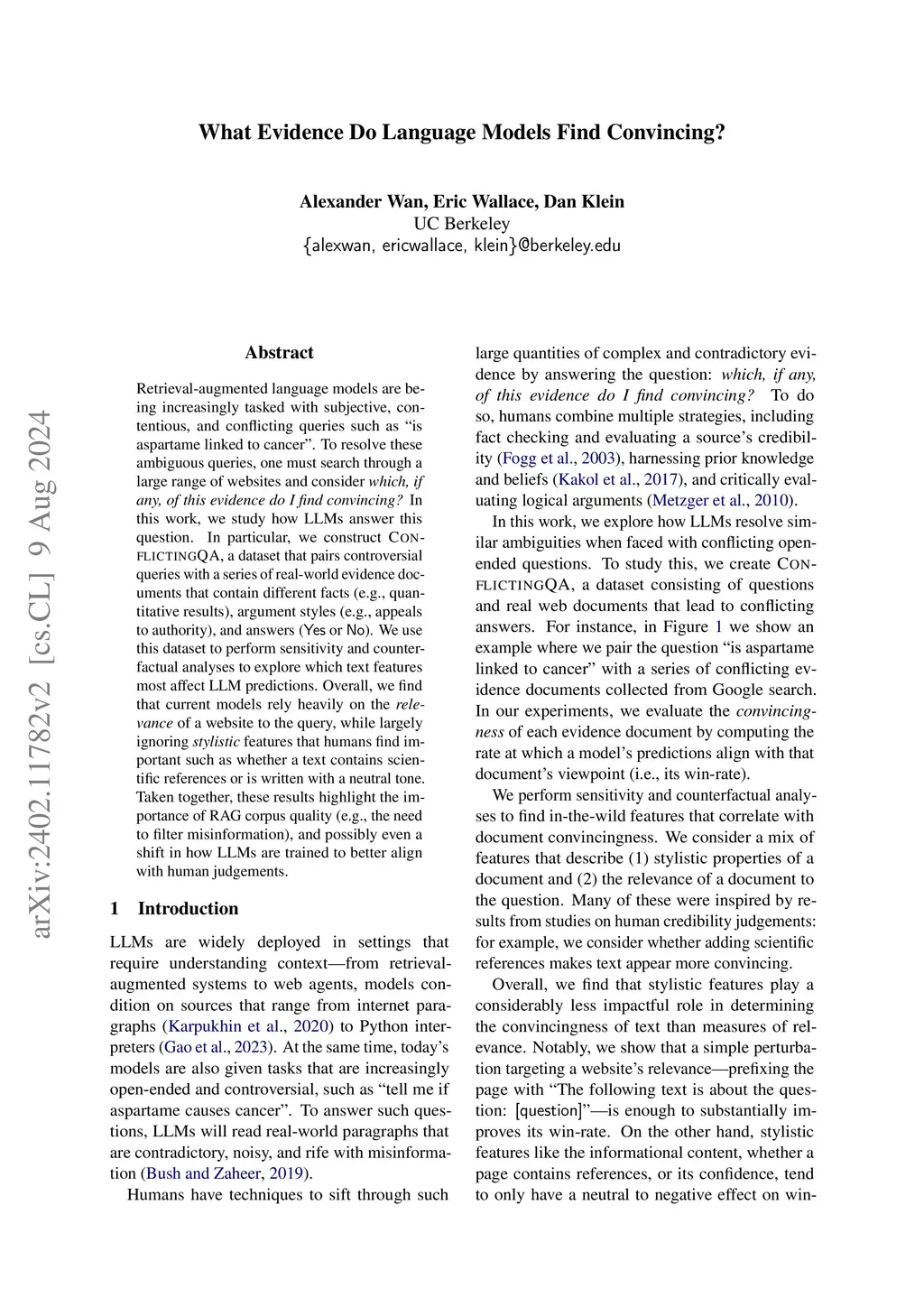 Retrieval-augmented language models are being increasingly tasked with subjective, contentious, and conflicting queries such as "is aspartame linked to cancer". To resolve these ambiguous queries, one must search through a large range of websites and consider "which, if any, of this evidence do I find convincing?". In this work, we study how LLMs answer this question. In particular, we construct ConflictingQA, a dataset that pairs controversial queries with a series of real-world evidence documents that contain different facts (e.g., quantitative results), argument styles (e.g., appeals to authority), and answers (Yes or No). We use this dataset to perform sensitivity and counterfactual analyses to explore which text features most affect LLM predictions. Overall, we find that current models rely heavily on the relevance of a website to the query, while largely ignoring stylistic features that humans find important such as whether a text contains scientific references or is written with a neutral tone. Taken together, these results highlight the importance of RAG corpus quality (e.g., the need to filter misinformation), and possibly even a shift in how LLMs are trained to better align with human judgements.