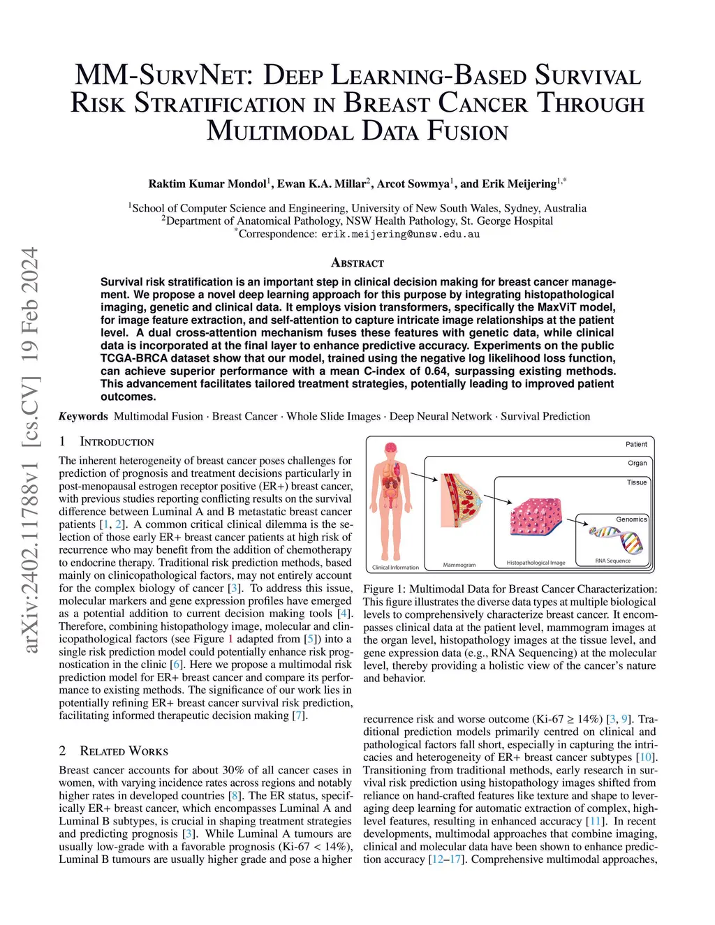 Survival risk stratification is an important step in clinical decision making for breast cancer management. We propose a novel deep learning approach for this purpose by integrating histopathological imaging, genetic and clinical data. It employs vision transformers, specifically the MaxViT model, for image feature extraction, and self-attention to capture intricate image relationships at the patient level. A dual cross-attention mechanism fuses these features with genetic data, while clinical data is incorporated at the final layer to enhance predictive accuracy. Experiments on the public TCGA-BRCA dataset show that our model, trained using the negative log likelihood loss function, can achieve superior performance with a mean C-index of 0.64, surpassing existing methods. This advancement facilitates tailored treatment strategies, potentially leading to improved patient outcomes.