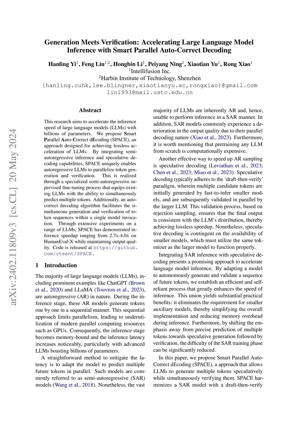 This research aims to accelerate the inference speed of large language models (LLMs) with billions of parameters. We propose \textbf{S}mart \textbf{P}arallel \textbf{A}uto-\textbf{C}orrect d\textbf{E}coding (SPACE), an innovative approach designed for achieving lossless acceleration of LLMs. By integrating semi-autoregressive inference and speculative decoding capabilities, SPACE uniquely enables autoregressive LLMs to parallelize token generation and verification. This is realized through a specialized semi-autoregressive supervised fine-tuning process that equips existing LLMs with the ability to simultaneously predict multiple tokens. Additionally, an auto-correct decoding algorithm facilitates the simultaneous generation and verification of token sequences within a single model invocation. Through extensive experiments on a range of LLMs, SPACE has demonstrated inference speedup ranging from 2.7x-4.0x on HumanEval-X while maintaining output quality.