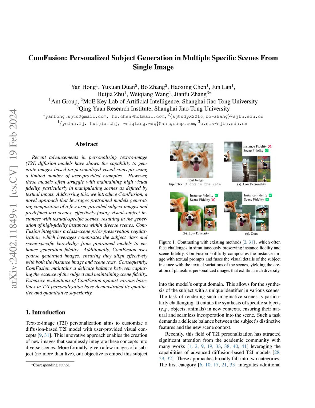 Recent advancements in personalizing text-to-image (T2I) diffusion models have shown the capability to generate images based on personalized visual concepts using a limited number of user-provided examples. However, these models often struggle with maintaining high visual fidelity, particularly in manipulating scenes as defined by textual inputs. Addressing this, we introduce ComFusion, a novel approach that leverages pretrained models generating composition of a few user-provided subject images and predefined-text scenes, effectively fusing visual-subject instances with textual-specific scenes, resulting in the generation of high-fidelity instances within diverse scenes. ComFusion integrates a class-scene prior preservation regularization, which leverages composites the subject class and scene-specific knowledge from pretrained models to enhance generation fidelity. Additionally, ComFusion uses coarse generated images, ensuring they align effectively with both the instance image and scene texts. Consequently, ComFusion maintains a delicate balance between capturing the essence of the subject and maintaining scene fidelity.Extensive evaluations of ComFusion against various baselines in T2I personalization have demonstrated its qualitative and quantitative superiority.