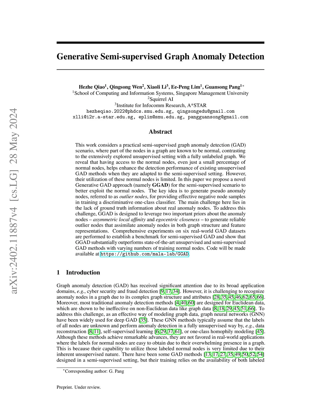 This work considers a practical semi-supervised graph anomaly detection (GAD) scenario, where part of the nodes in a graph are known to be normal, contrasting to the extensively explored unsupervised setting with a fully unlabeled graph. We reveal that having access to the normal nodes, even just a small percentage of normal nodes, helps enhance the detection performance of existing unsupervised GAD methods when they are adapted to the semi-supervised setting. However, their utilization of these normal nodes is limited. In this paper, we propose a novel Generative GAD approach (namely GGAD) for the semi-supervised scenario to better exploit the normal nodes. The key idea is to generate pseudo anomaly nodes, referred to as óutlier nodes', for providing effective negative node samples in training a discriminative one-class classifier. The main challenge here lies in the lack of ground truth information about real anomaly nodes. To address this challenge, GGAD is designed to leverage two important priors about the anomaly nodes -- asymmetric local affinity and egocentric closeness -- to generate reliable outlier nodes that assimilate anomaly nodes in both graph structure and feature representations. Comprehensive experiments on six real-world GAD datasets are performed to establish a benchmark for semi-supervised GAD and show that GGAD substantially outperforms state-of-the-art unsupervised and semi-supervised GAD methods with varying numbers of training normal nodes. Code will be made available at https://github.com/mala-lab/GGAD.