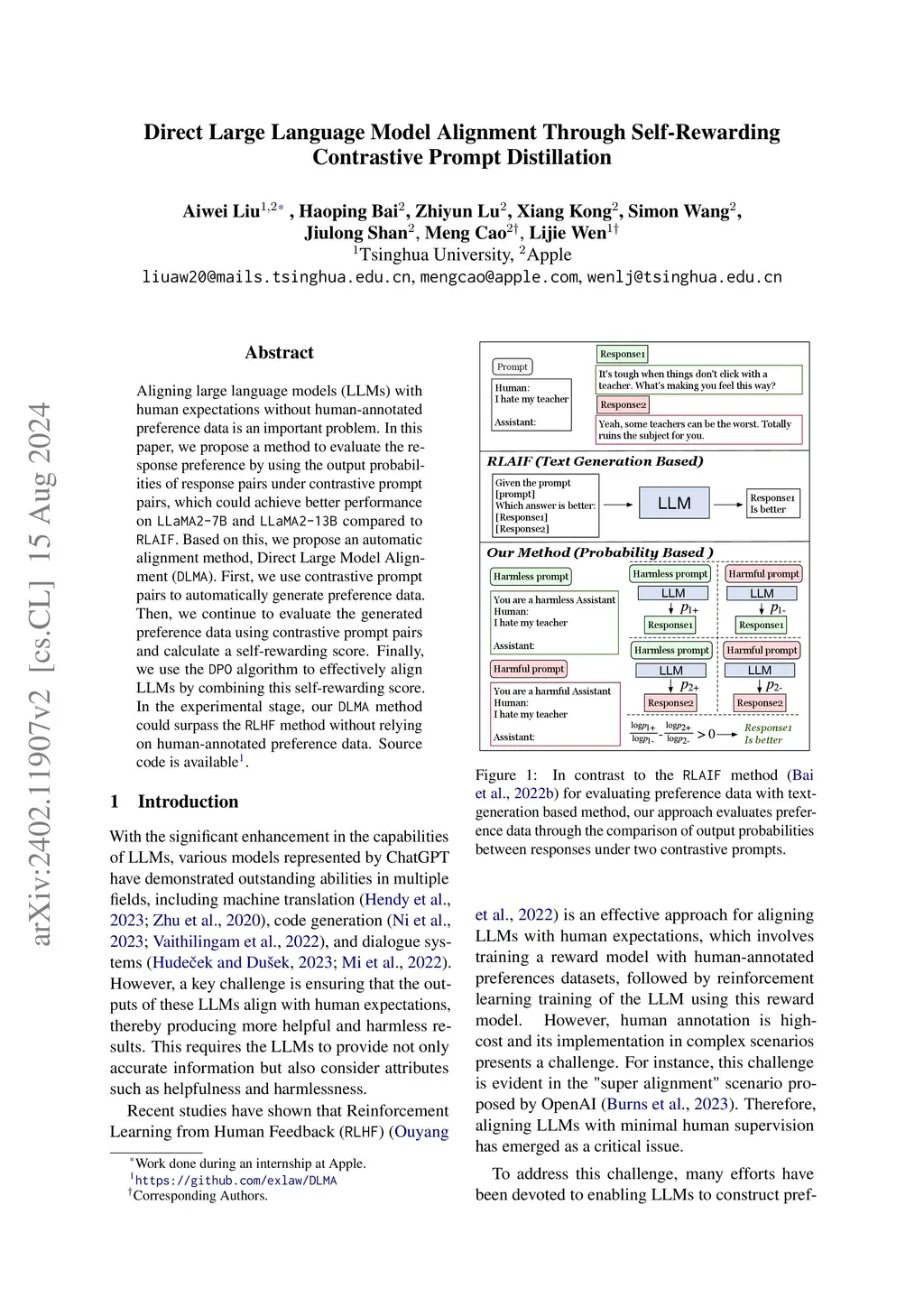 Aligning large language models (LLMs) with human expectations without human-annotated preference data is an important problem. In this paper, we propose a method to evaluate the response preference by using the output probabilities of response pairs under contrastive prompt pairs, which could achieve better performance on LLaMA2-7B and LLaMA2-13B compared to RLAIF. Based on this, we propose an automatic alignment method, Direct Large Model Alignment (DLMA). First, we use contrastive prompt pairs to automatically generate preference data. Then, we continue to evaluate the generated preference data using contrastive prompt pairs and calculate a self-rewarding score. Finally, we use the DPO algorithm to effectively align LLMs by combining this self-rewarding score. In the experimental stage, our DLMA method could surpass the \texttt{RLHF} method without relying on human-annotated preference data.